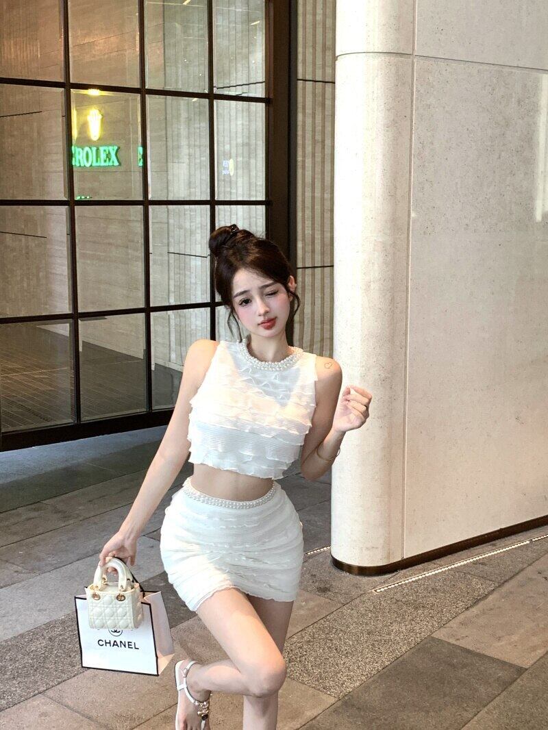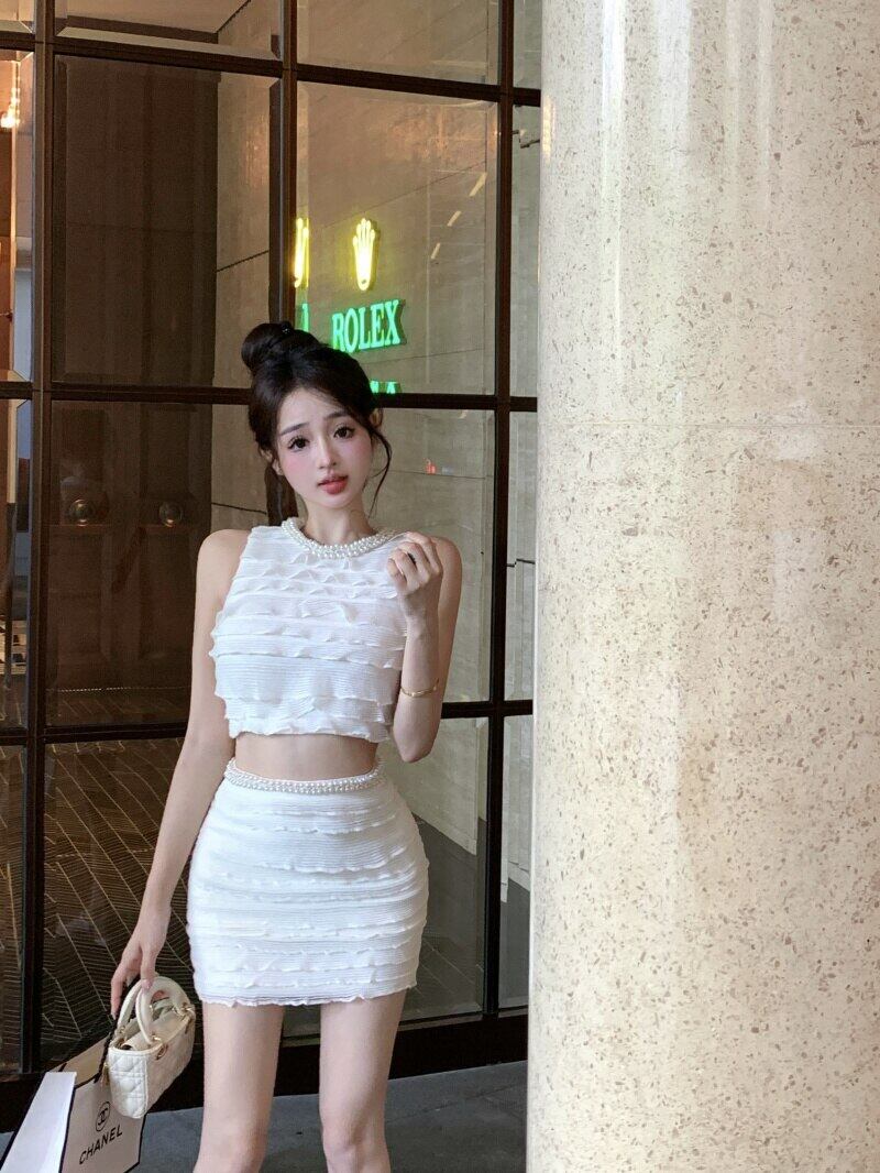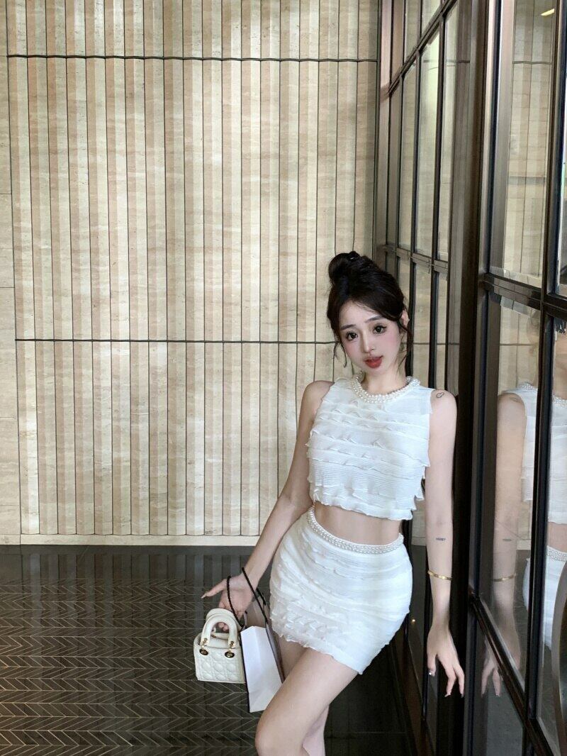 フランス高級ビーズ小さ香り良い 2 点セットセクシークロップトップ + ミニスカートスーツ Y2K 夏 2 ピース衣装 サマー 夏物