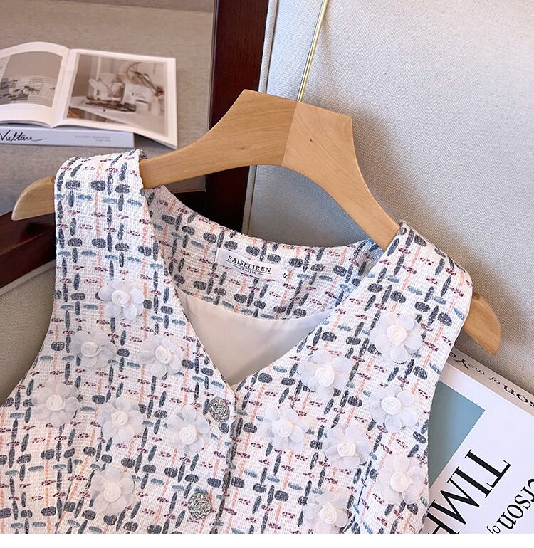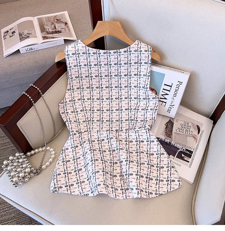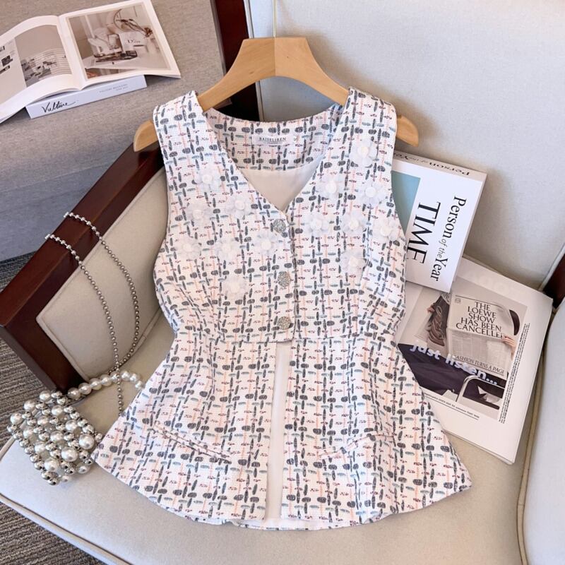 ストリートフレンチ小さ香り夏 V ネックノースリーブトップスストリートチェック柄ツイードベストコート サマー 夏物 Vネック