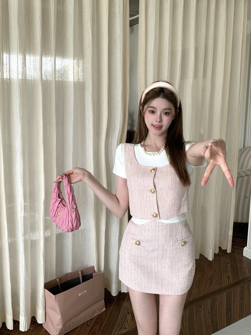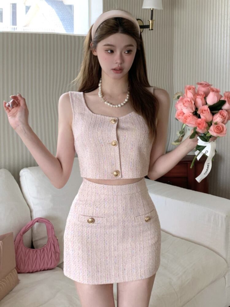 フランス小さ香りツイード 2 点セットベストクロップトップ + スカートスーツ甘い 2 ピース衣装 大人ガーリー スウィート キュート カジュアル