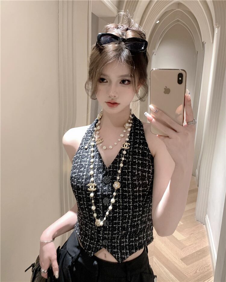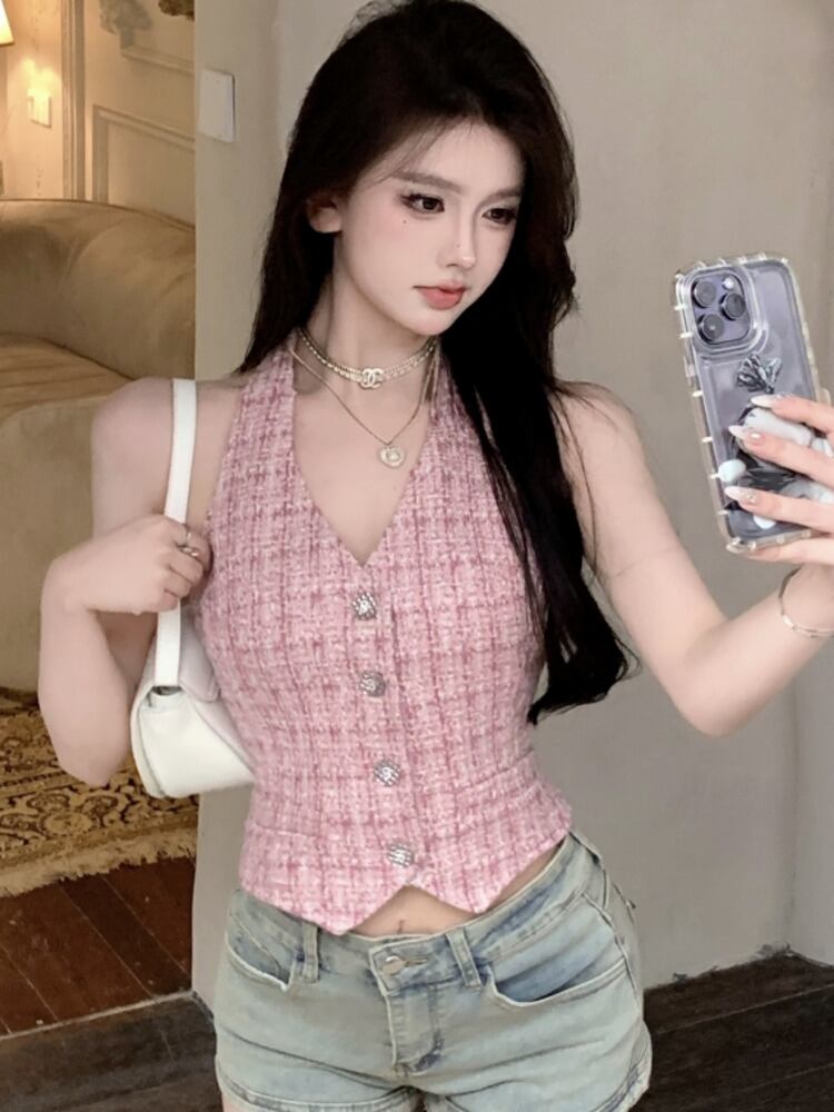 フランス高級夏 V ネックノースリーブ Hotsweet ツイードクロップトップストリートチェック柄ツイードベスト 大人ガーリー スウィート キュート カジュアル サマー 夏物 Vネック