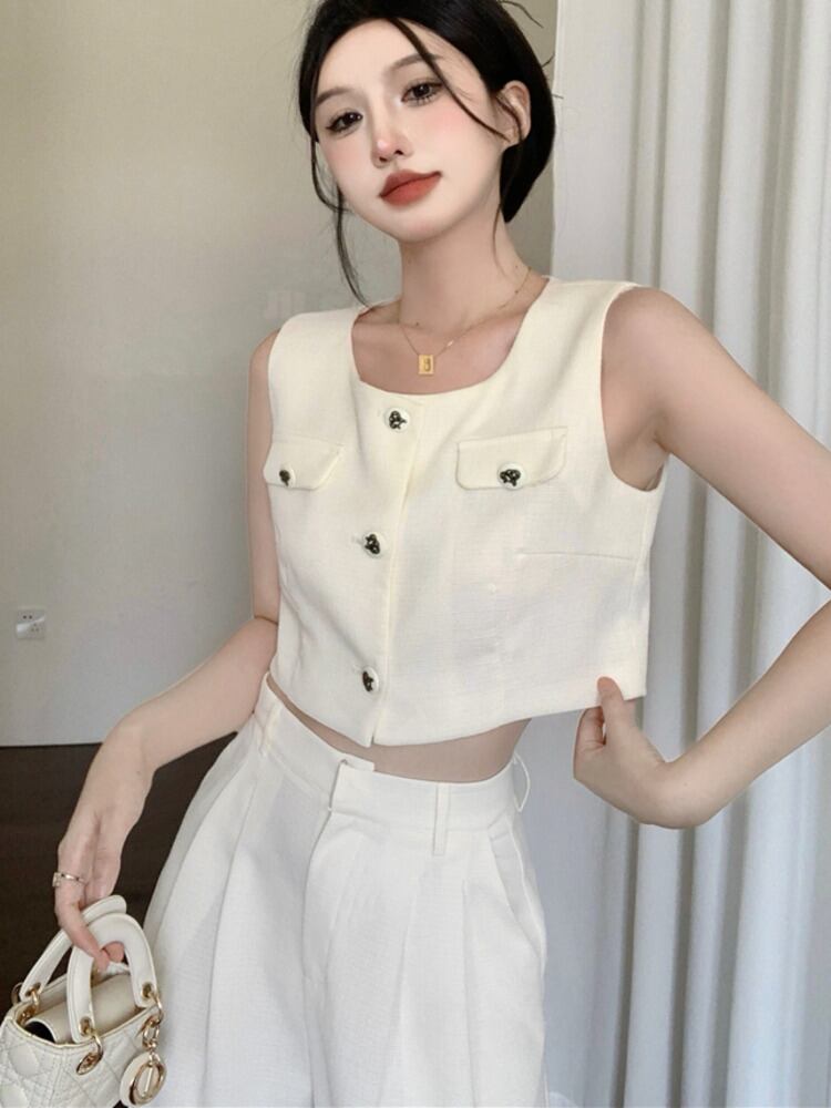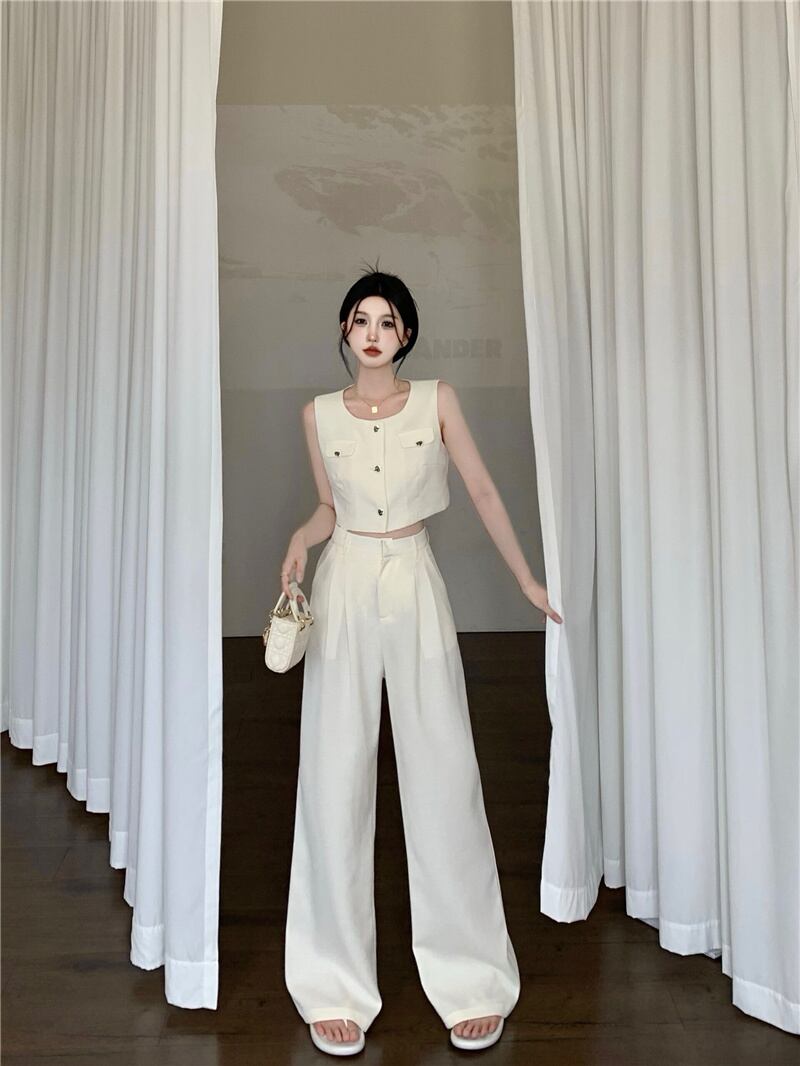 フランス小さ香りツーピースセットベストクロップトップ + ウエストワイドレッグパンツセット 2 ピーススーツ ワイドパンツ