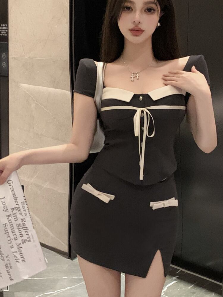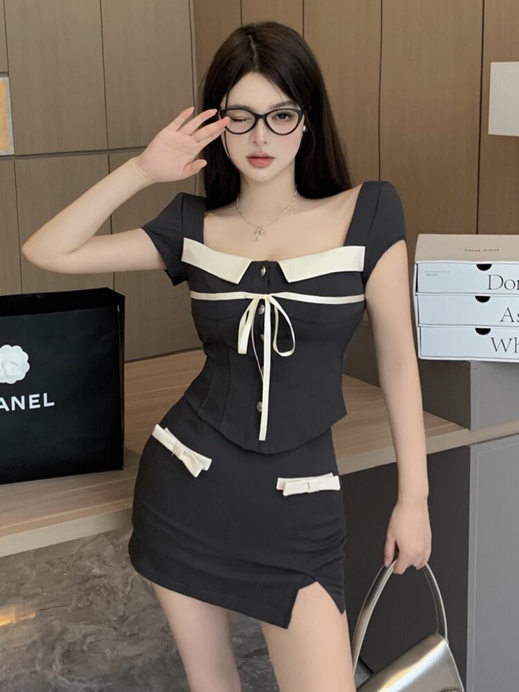 フランス小さフレグランス 2 点セットシャツトップ + ボディコンスカートセット甘い夏 2 ピース衣装 Conjuntos Cortos 大人ガーリー スウィート キュート カジュアル サマー 夏物