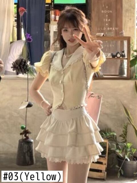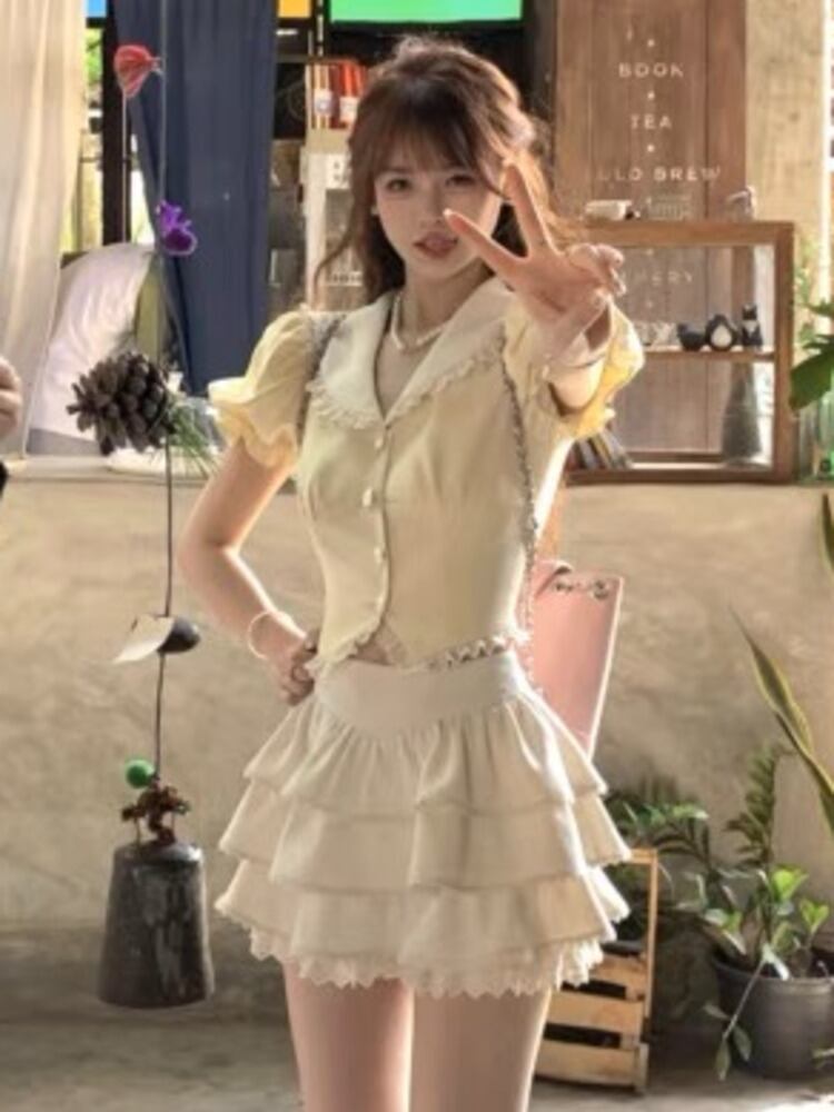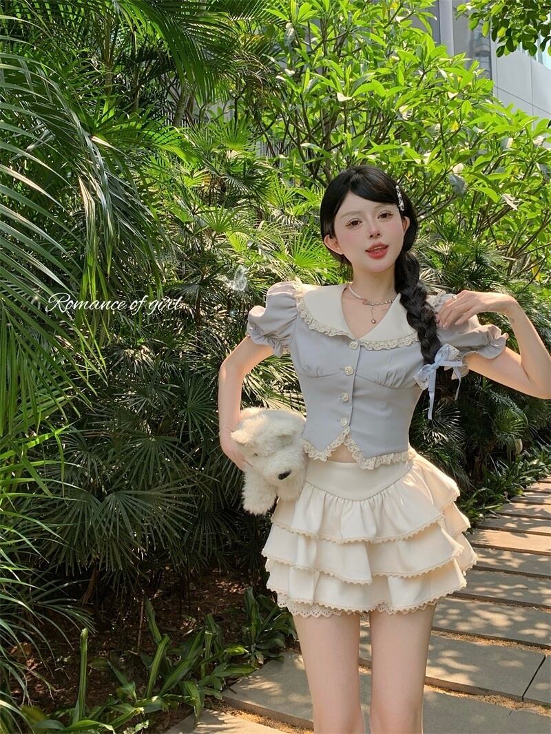 プレッピースタイルガールズスイートツーピースセットネイビーカラー半袖シャツトップ + ケーキスカートスーツ夏フレンチ 2 ピース衣装 ショート ハーフスリーブ 大人ガーリー スウィート キュート カジュアル サマー 夏物
