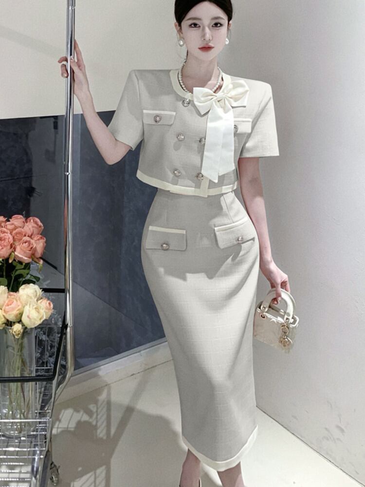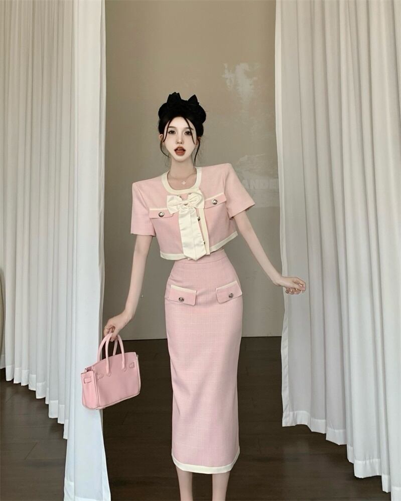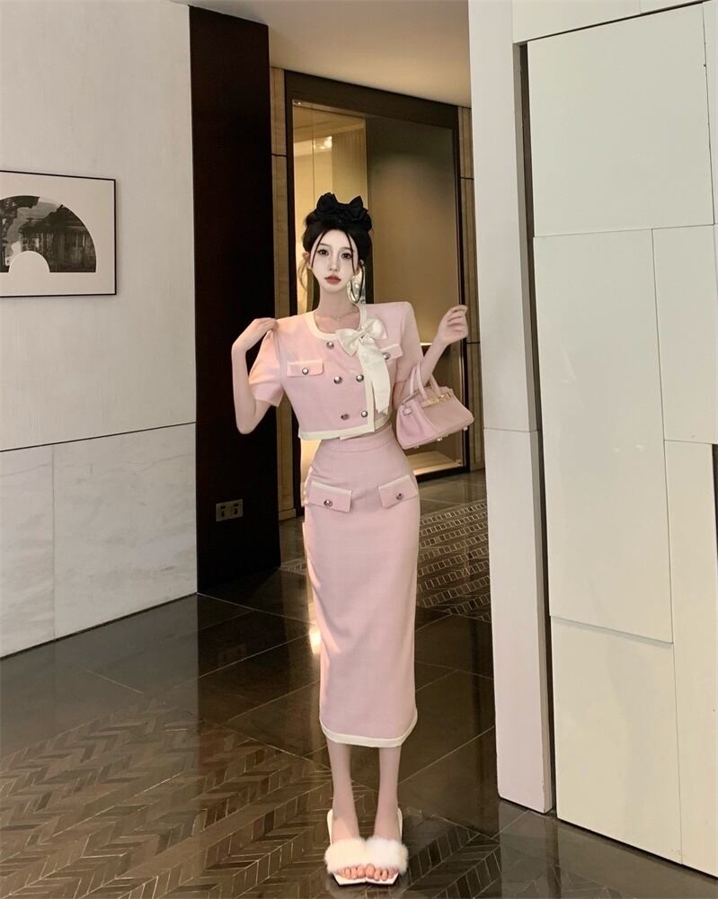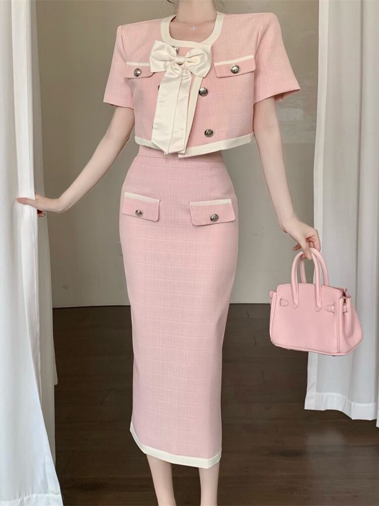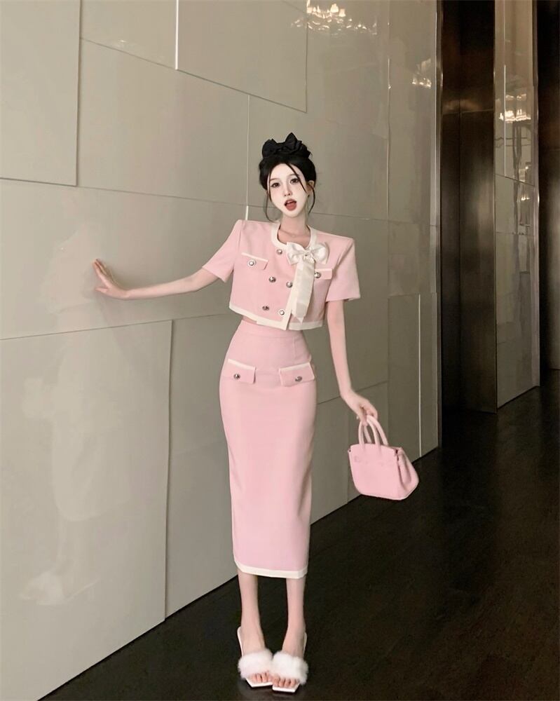 スモールフレグランスツーピースセット弓ショートジャケットコート+ウエストスプリットスカートスーツ甘い2ピース衣装 リボン 大人ガーリー スウィート キュート カジュアル