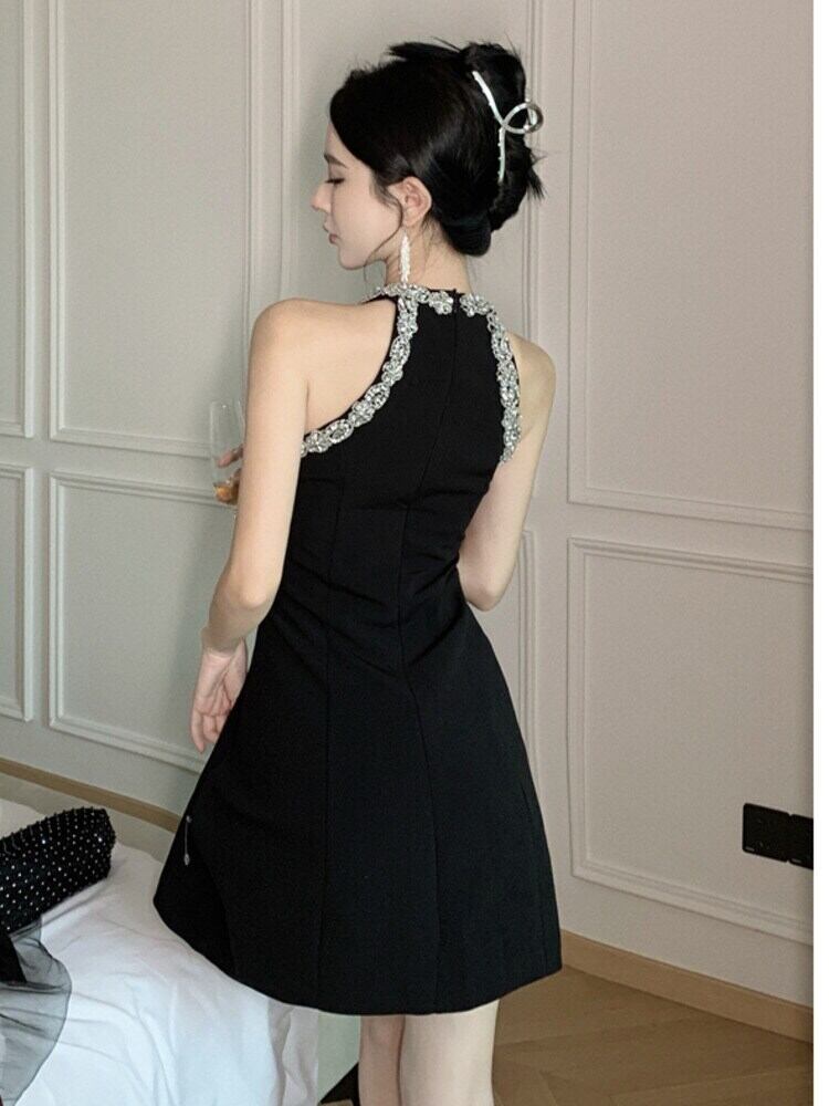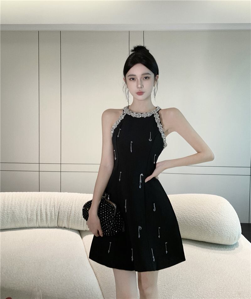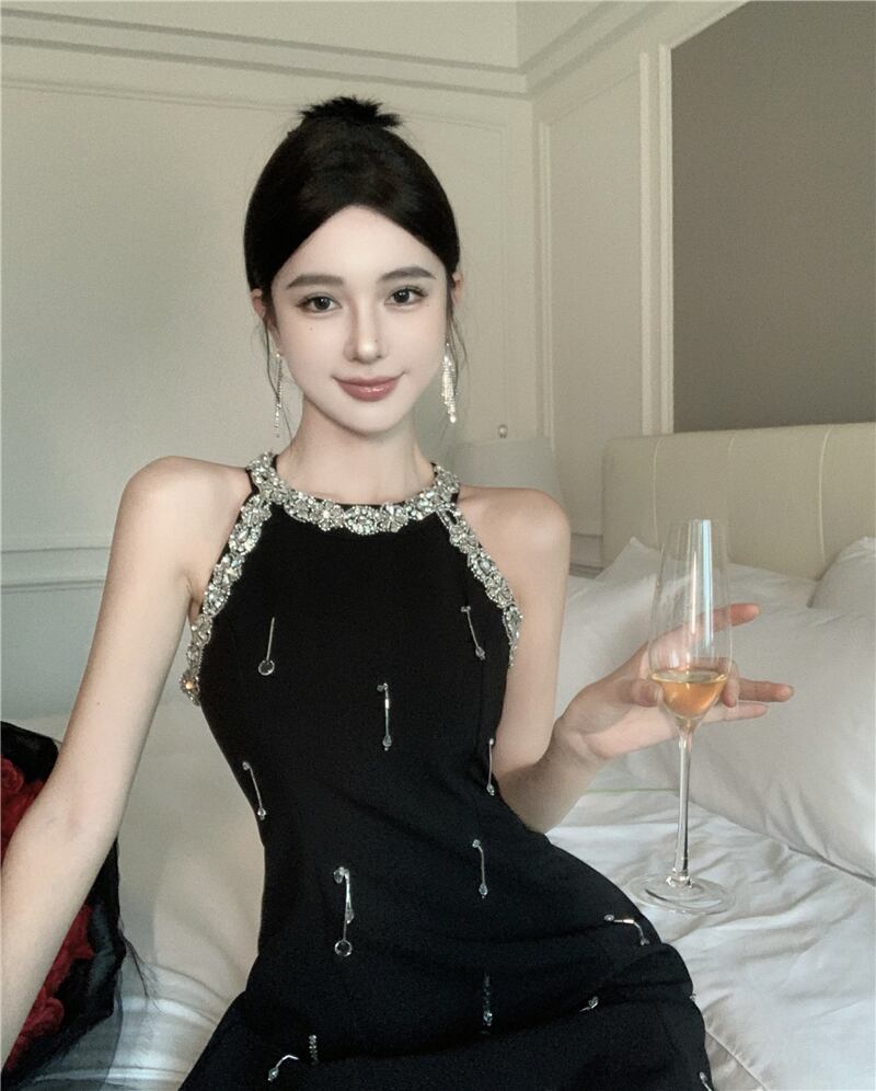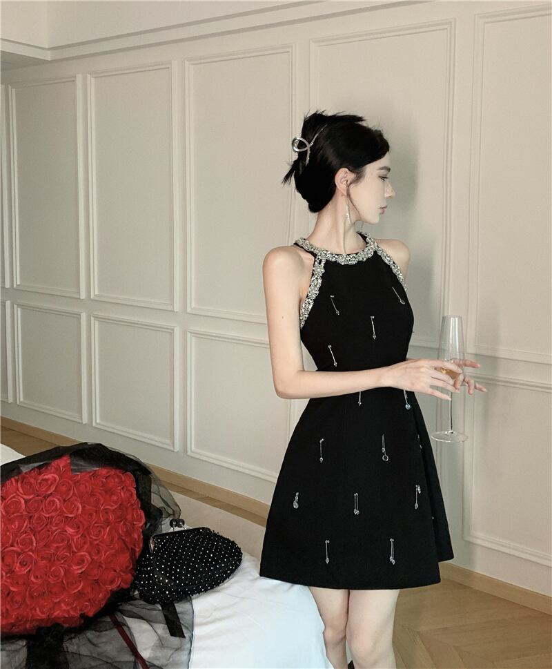 フレンチ高級ダイヤモンドビーズパーティードレス夏ノースリーブセクシードレスローブ サマー 夏物