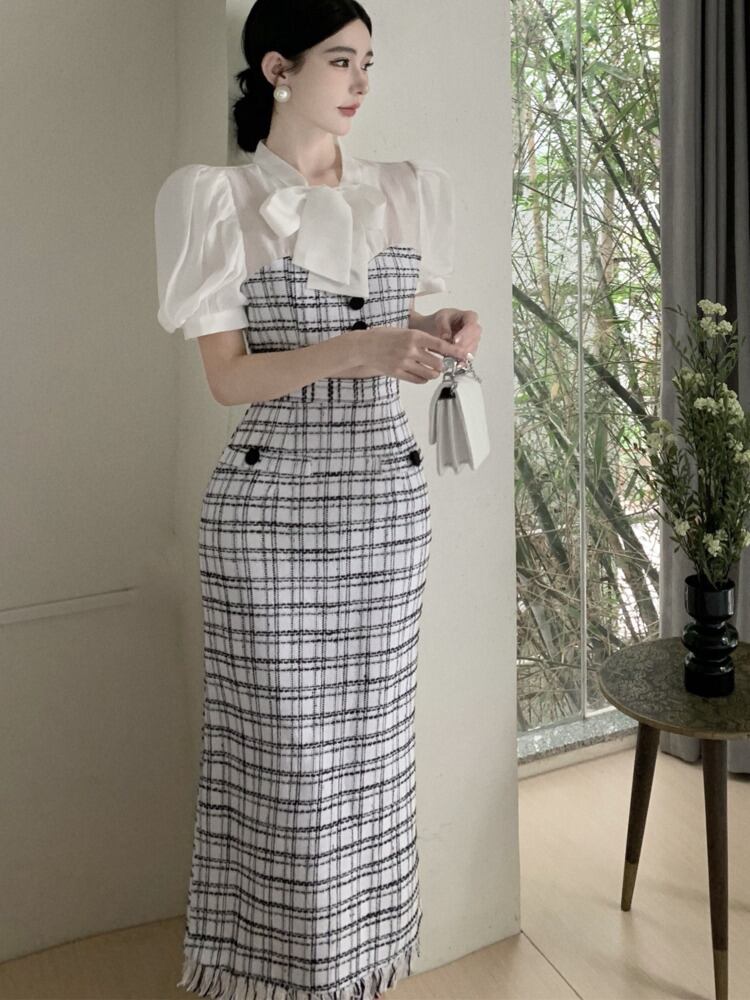 小さ香り 2 点セット衣装フレンチパッチワークバブルスリーブシャツトップ + 電話ロングスカート 2 点セット