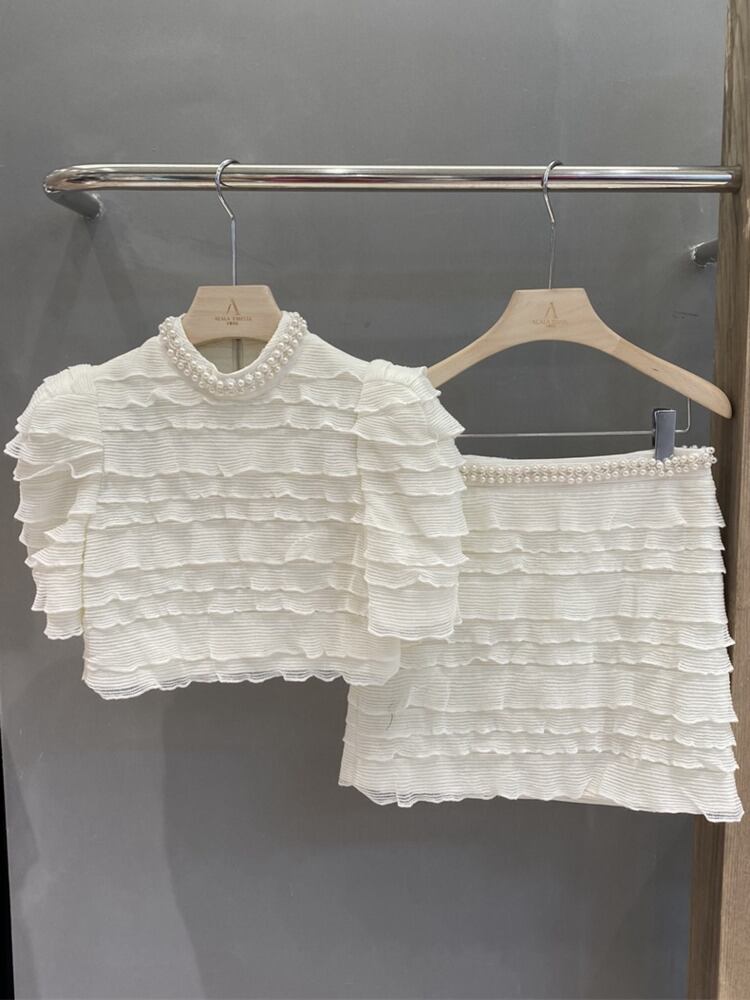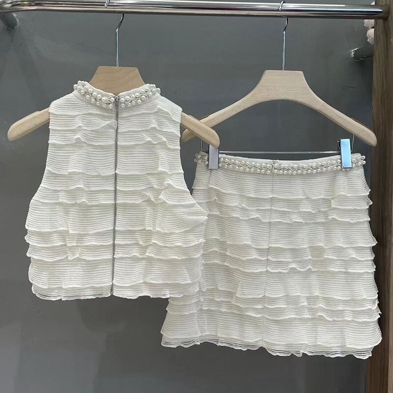 フランス小さフレグランス 2 点セット衣装高級ビーズクロップトップ + スカートツーピーススーツ Conjuntos Cortos