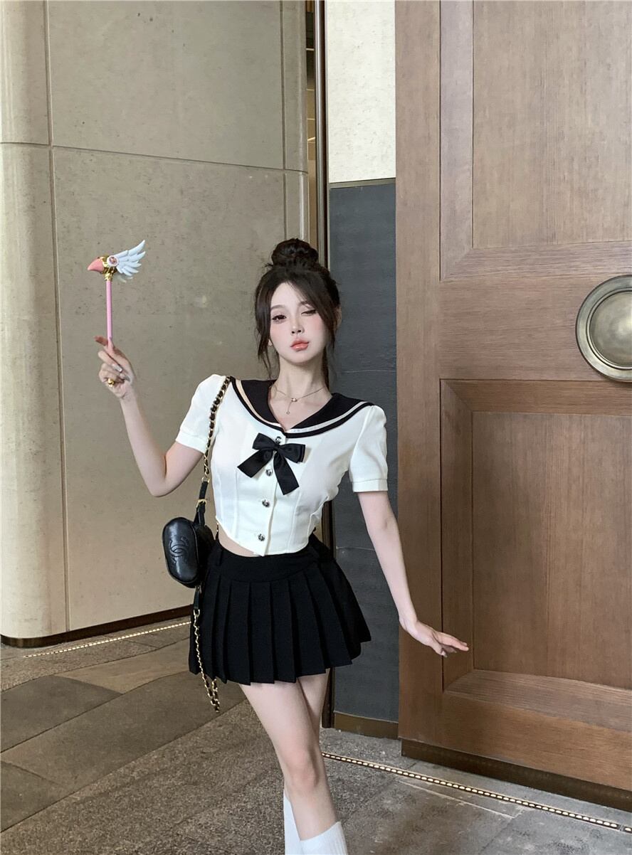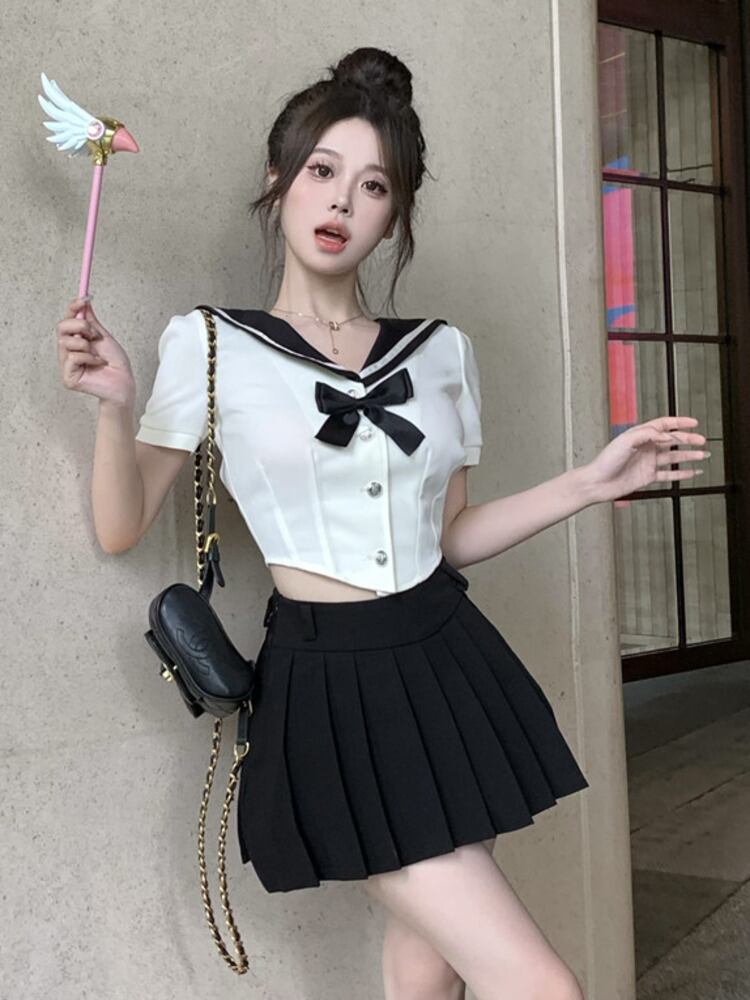 プレッピースタイル甘いツーピースセットセーラー襟ボウシャツトップ + ミニプリーツスカートスーツ女子 2 ピース衣装 リボン 大人ガーリー スウィート キュート カジュアル