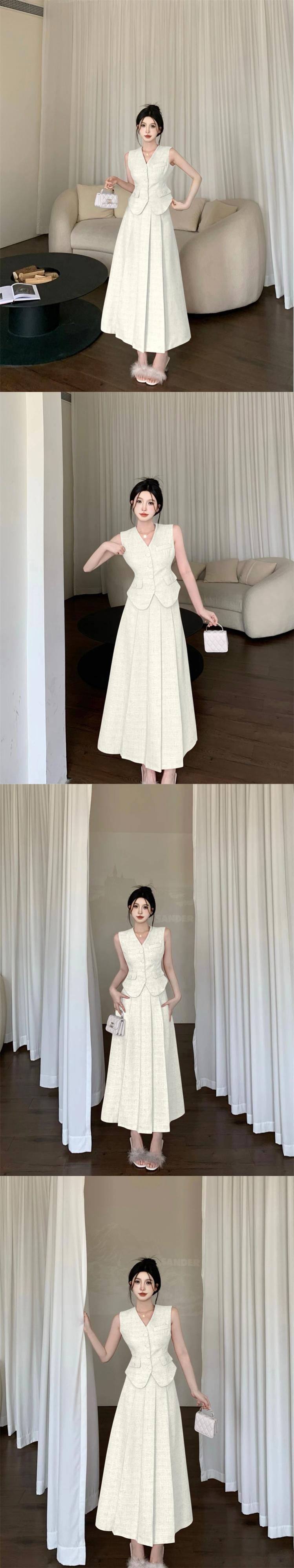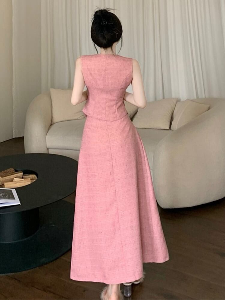 ストリートスモールフレグランスツーピースセットベストジャケットトップ+プリーツロングスカートセットOL 2ピース衣装