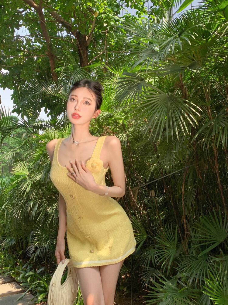 フランス小さ香りツイードパーティードレス甘い 3D フラワースリムサマードレスローブ 大人ガーリー スウィート キュート カジュアル 夏物 フラワーデザイン