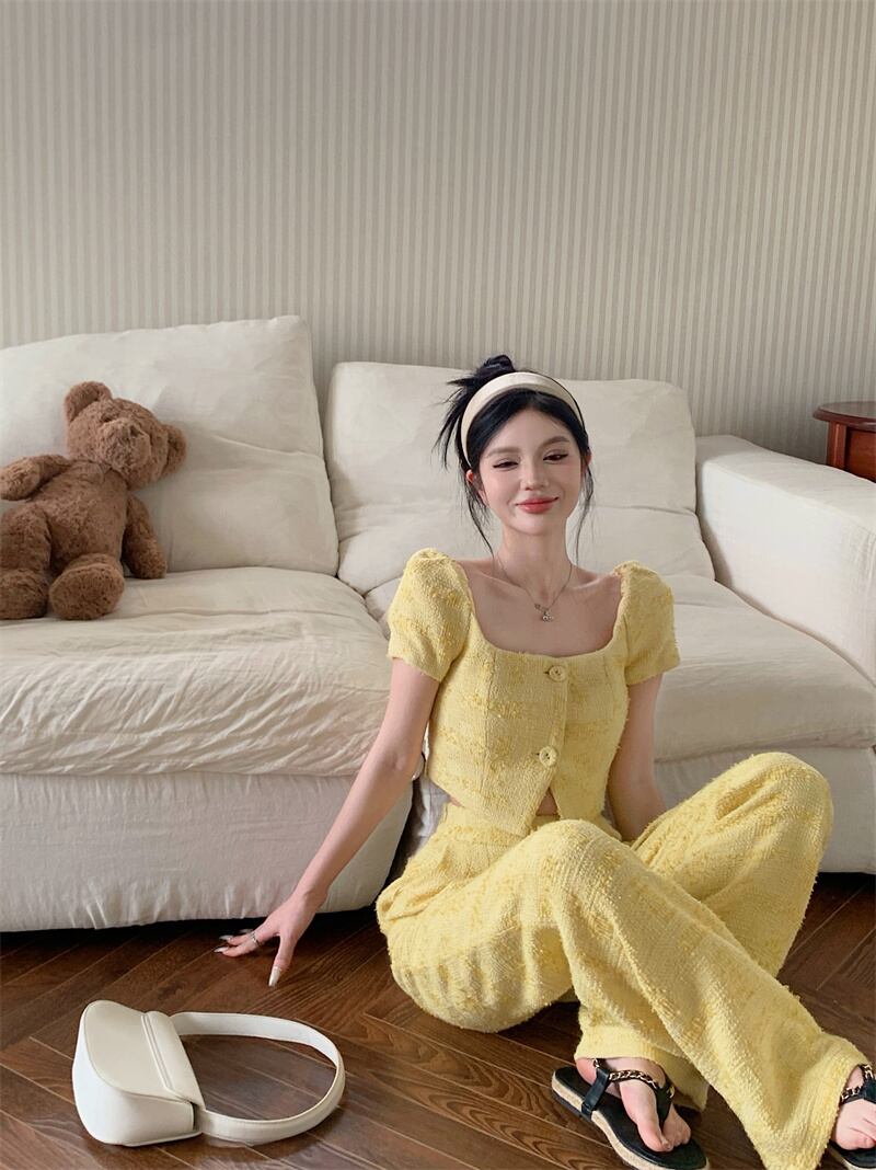 フレンチスモールフレグランスツーピースセットショートジャケットコート+ワイドレッグパンツセット因果2ピースパンツスーツ ワイドパンツ