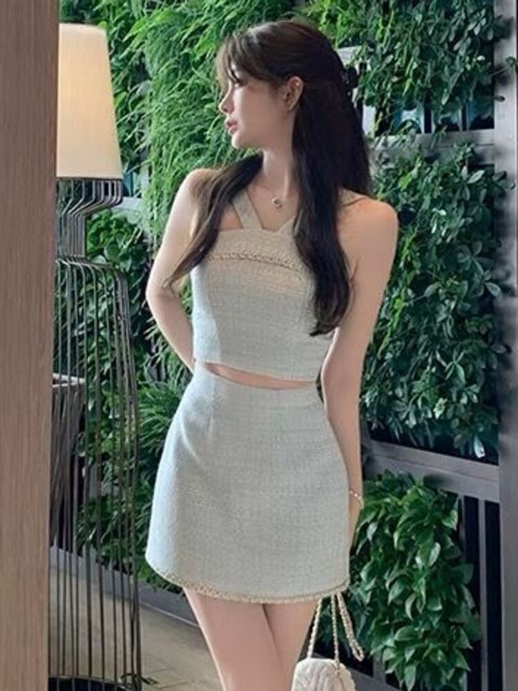 小さフレグランツイード 2 点セットホットスウィートセクシークロップトップ + ミニスカートセットスイートシック 2 ピーススーツ 大人ガーリー キュート カジュアル