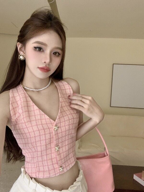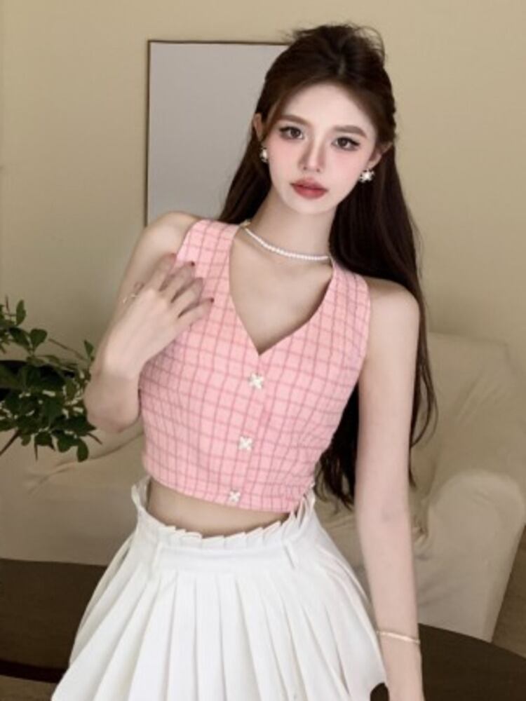 Hotsweet 小さ香りよいぶら下げネック V ネックセクシーベストタンククロップトップスイートシック織チェック柄ストラップトップス 大人ガーリー スウィート キュート カジュアル Vネック