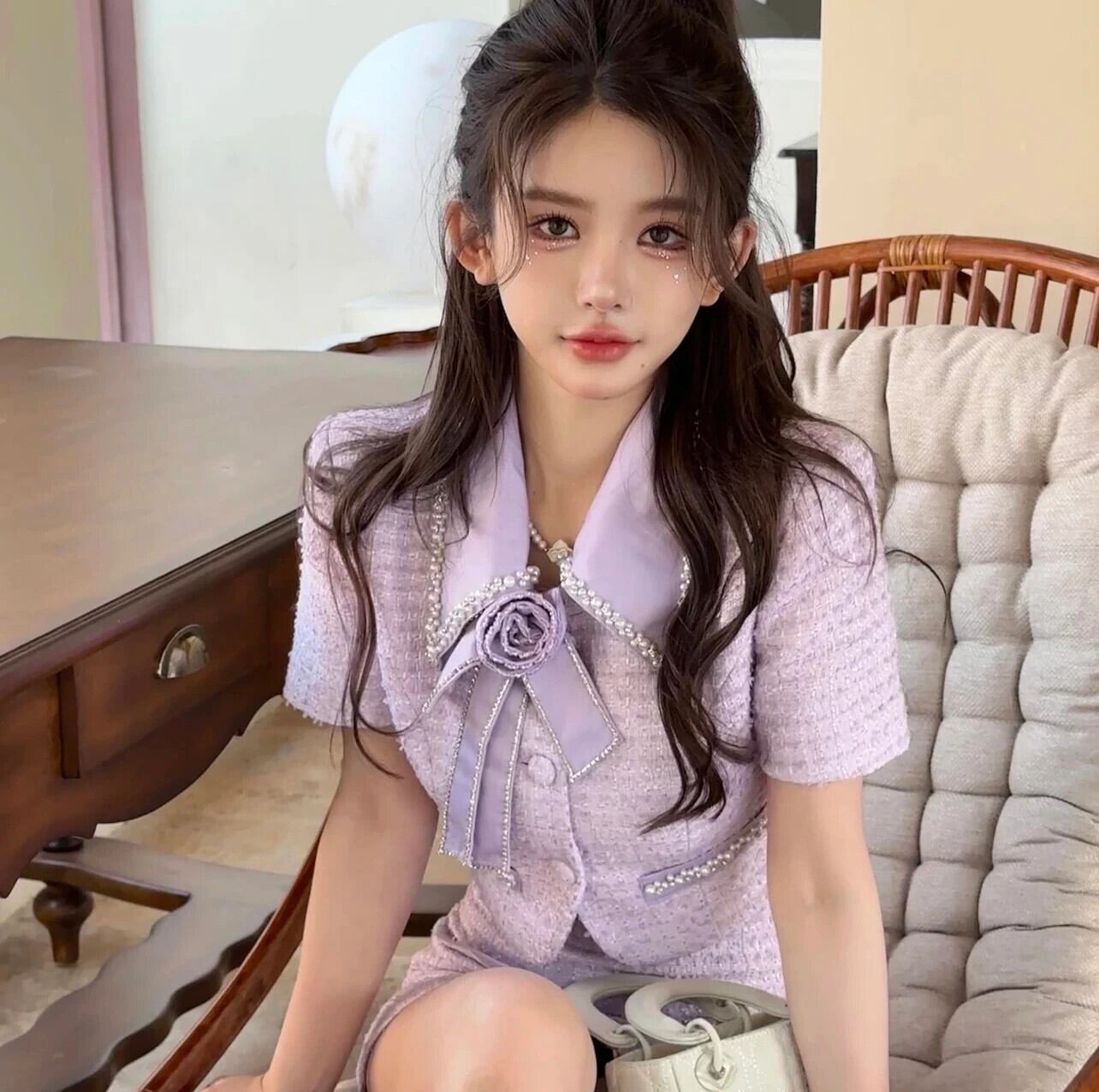 高級ビーズ小さ香り良い 2 点セット弓ジャケットコート + スカートスーツフレンチ 2 点セット リボン