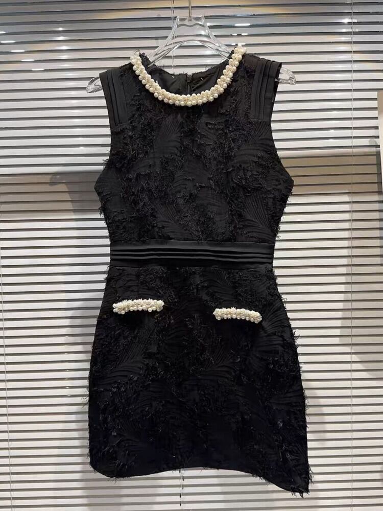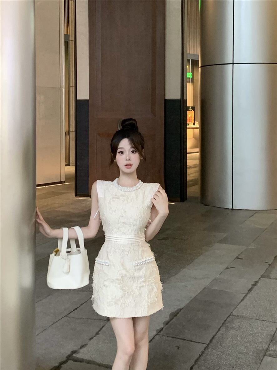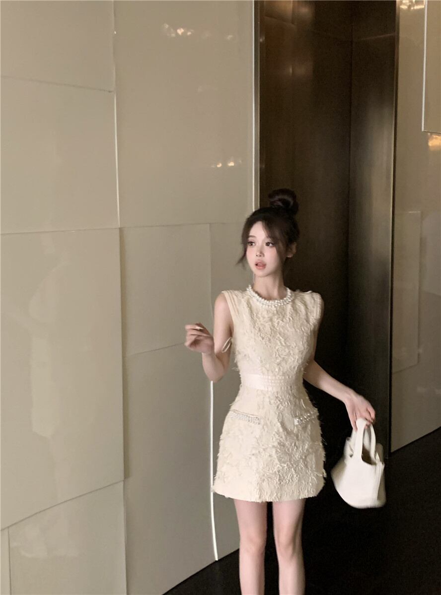 ストリートフレンチ高級ビーズ小さ香りサマードレスノースリーブパーティードレス 夏物