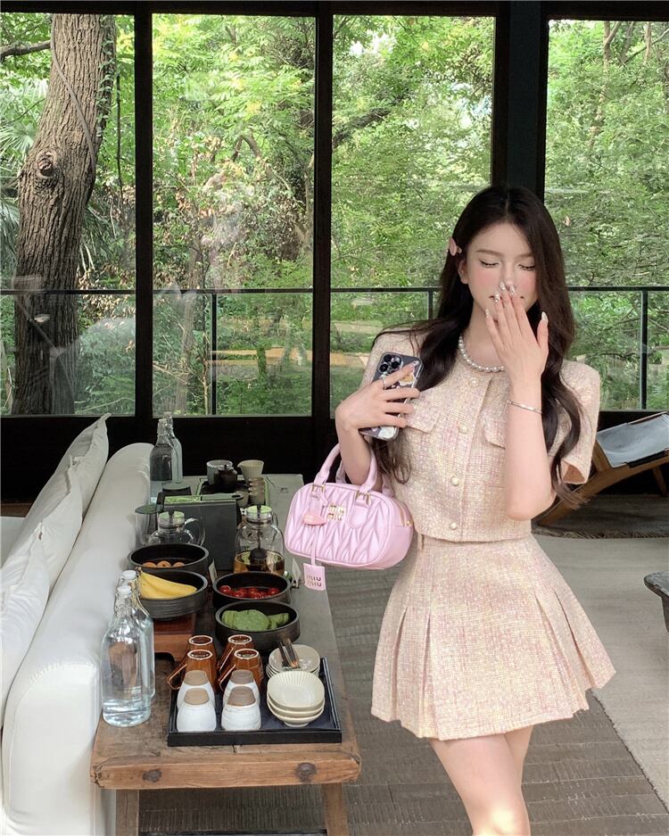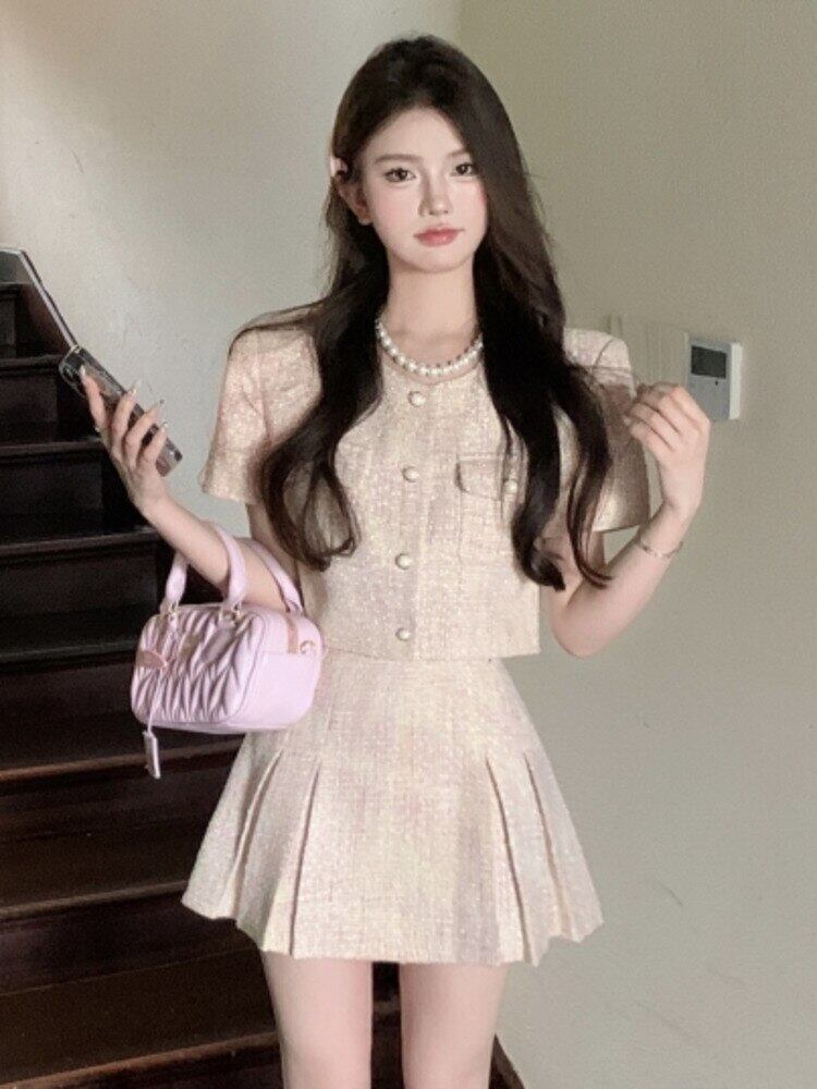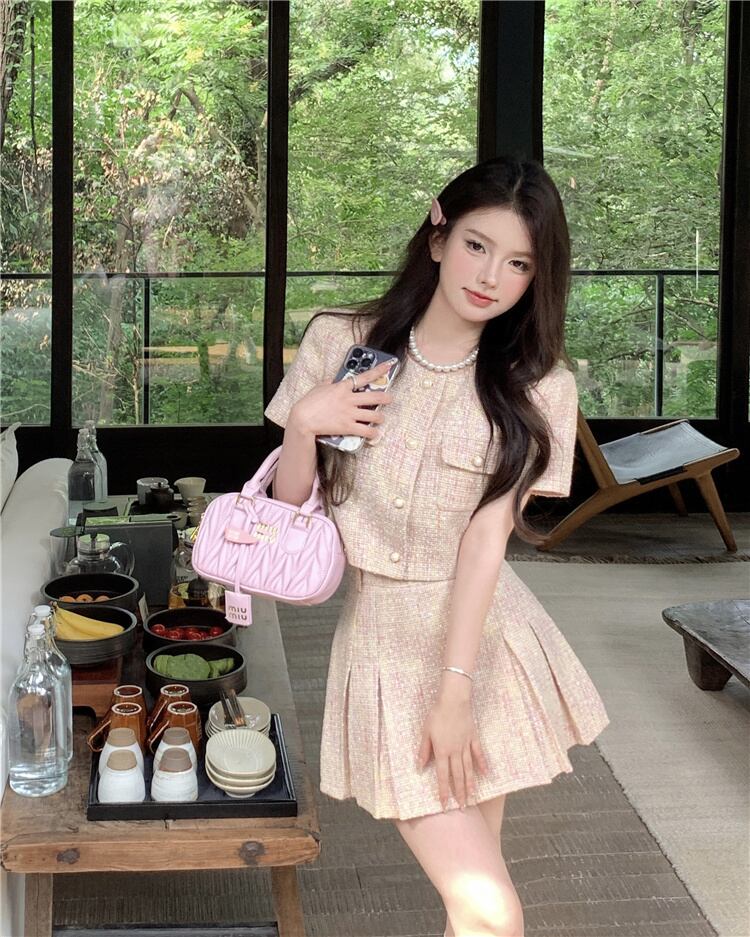 フランス小さ香りツイード 2 点セットショートジャケットコート + プリーツスカートセット 2 ピーススーツ