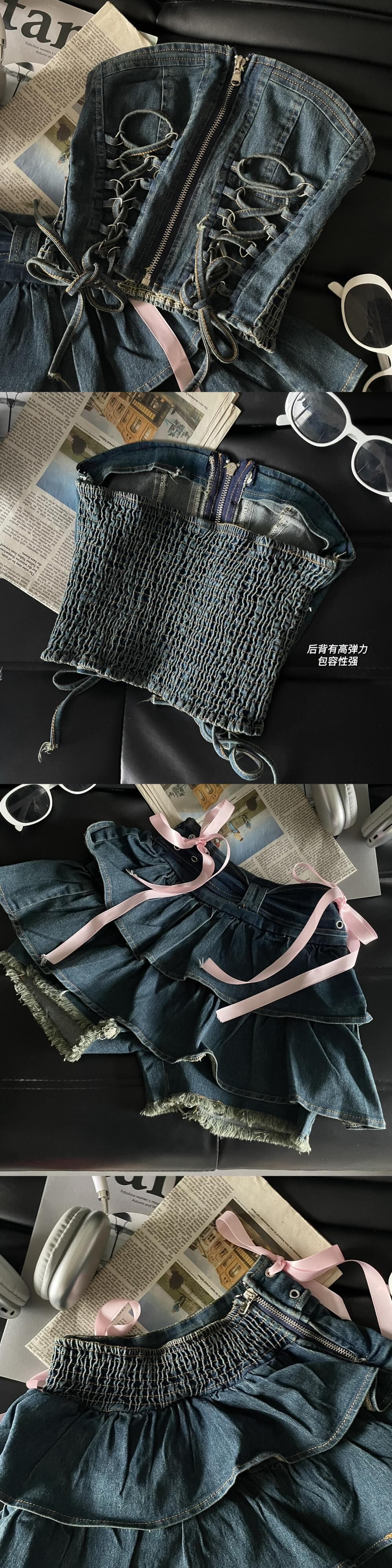 甘いデニム 2 ピースセット衣装 Hotsweet 包帯クロップトップ + ショートセット夏カウボーイ 2 ピースパンツセット 大人ガーリー スウィート キュート カジュアル サマー 夏物