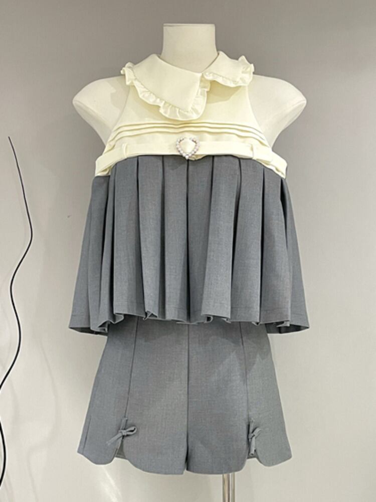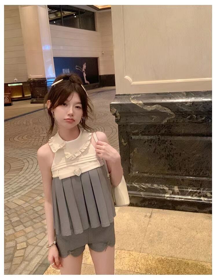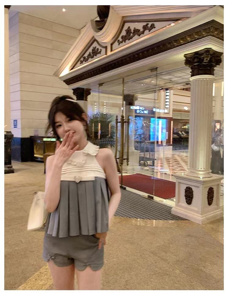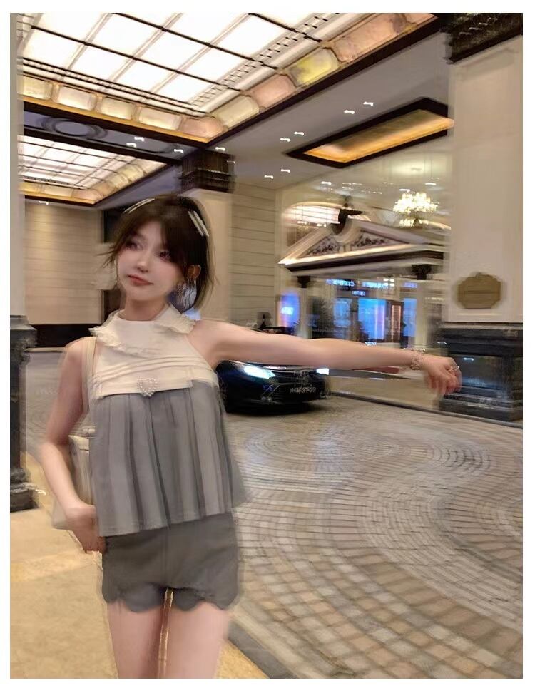 夏小さ香りツーピースセットルーズノースリーブブラウストップス + ショートセットプレッピースタイル 2 ピースパンツセット サマー 夏物