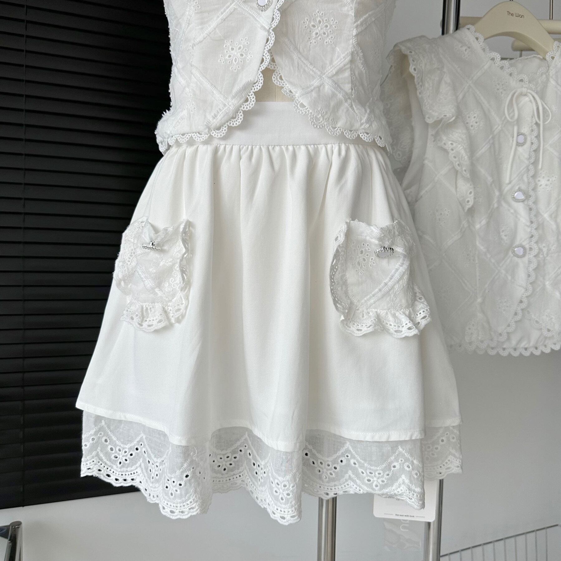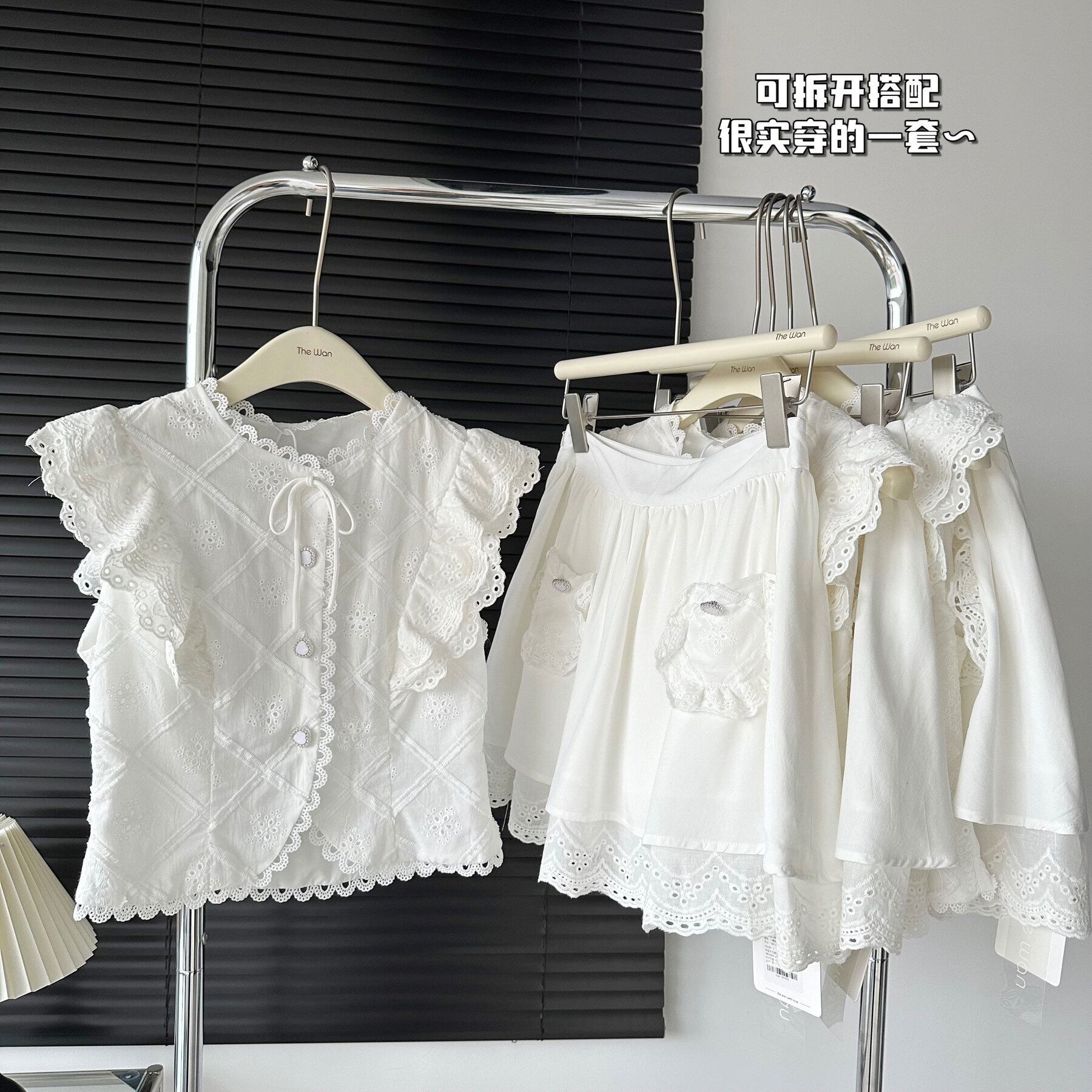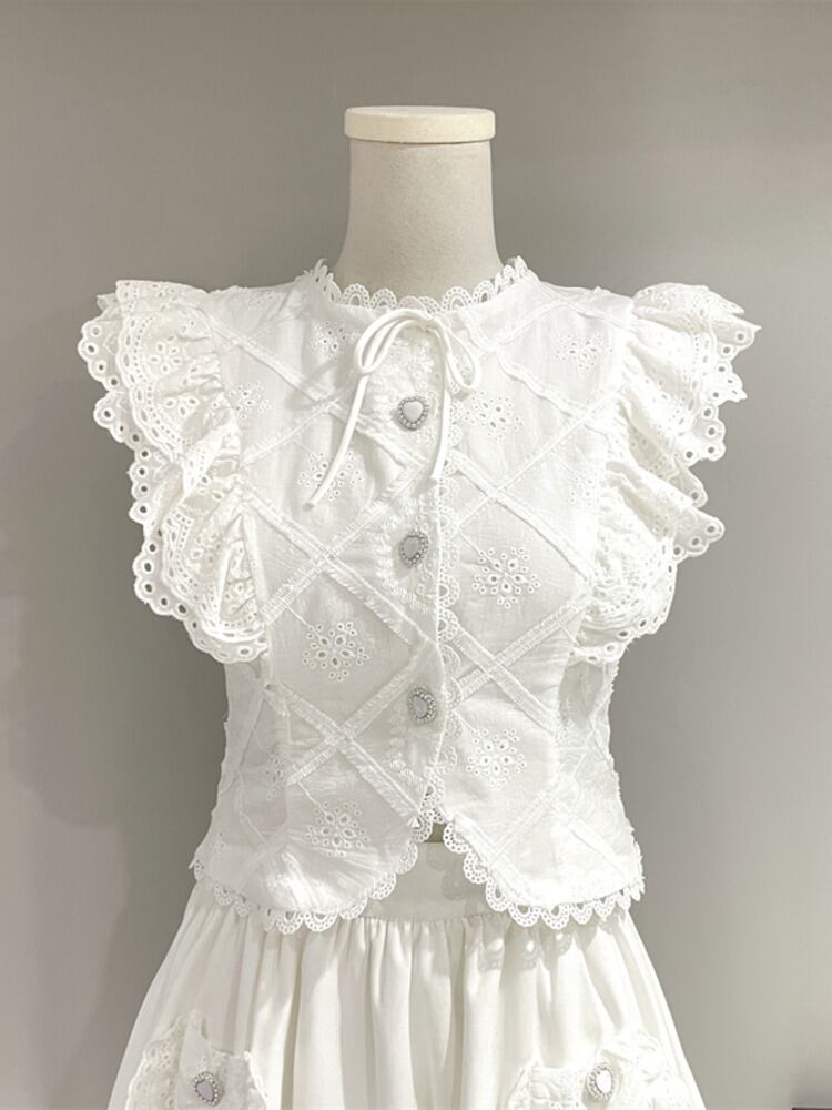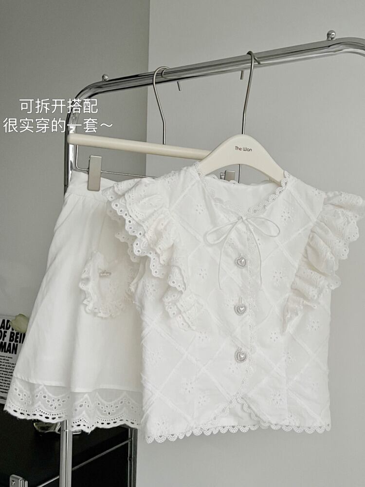 甘いツーピースセットフライングスリーブレースシャツトップ + ウエストスカートセット夏 2 ピーススーツ 大人ガーリー スウィート キュート カジュアル サマー 夏物