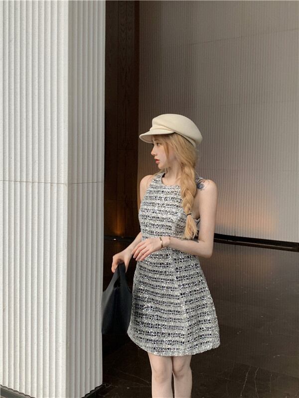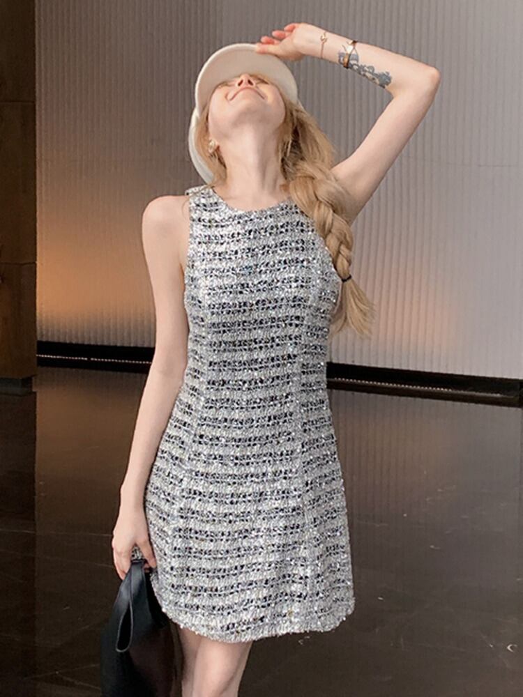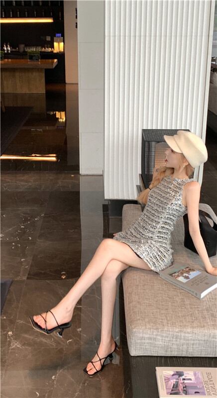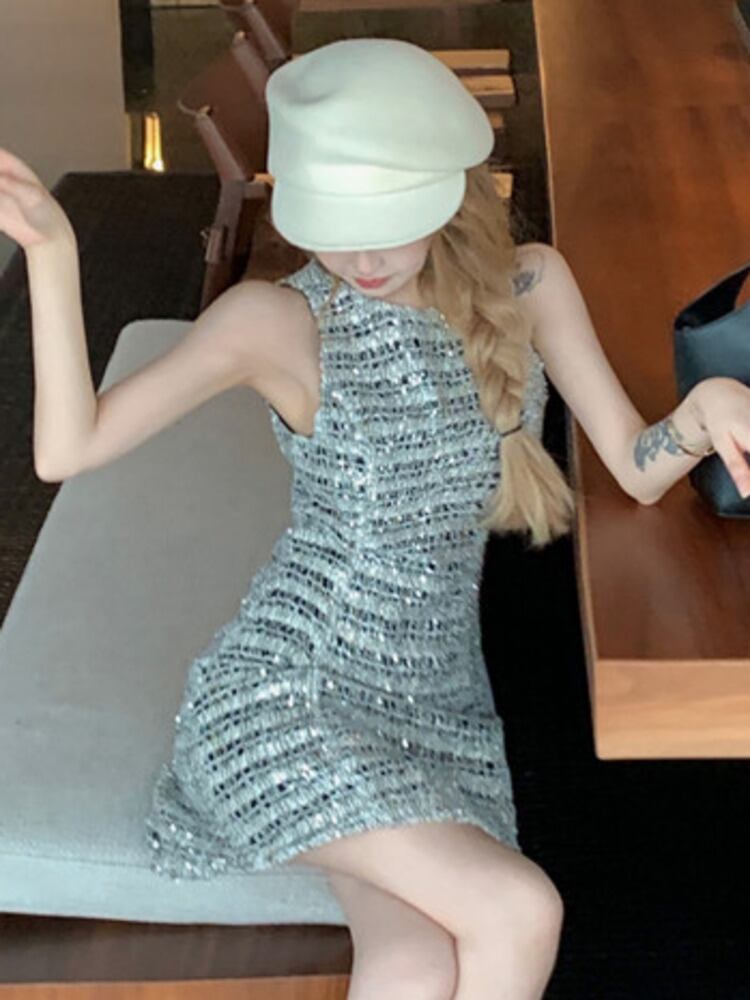Y2K スリムフィットノースリーブスパンコールサマードレスフレンチイブニングパーティードレス Vestido 夏物