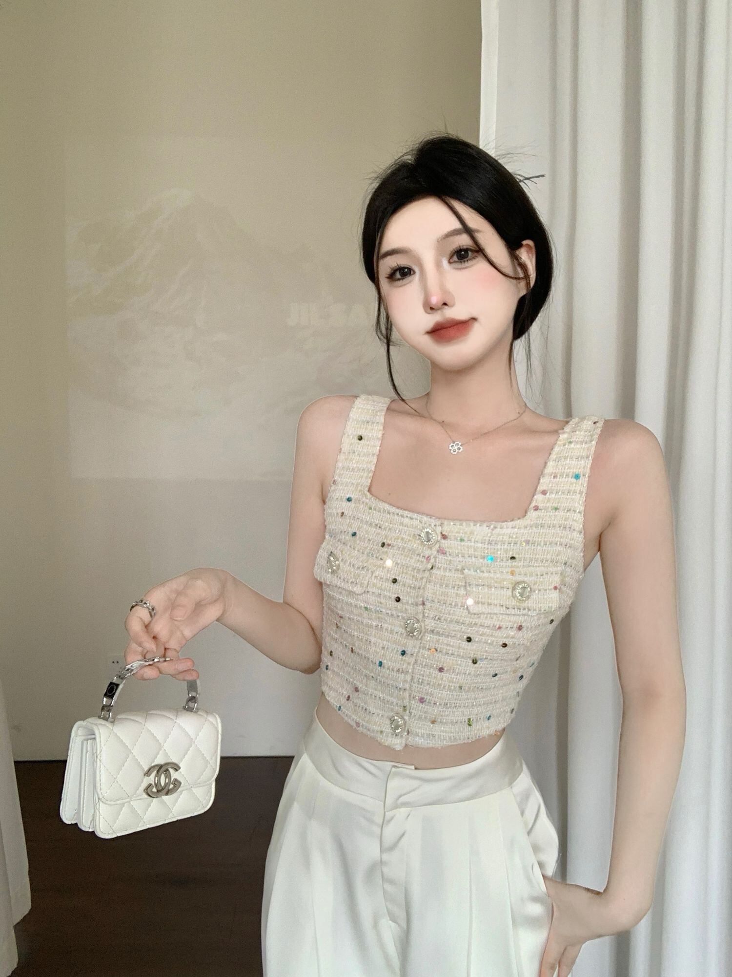 ストリートスモールフレグランスツーピースセットセクシーベストトップ&ワイドレッグパンツセットフレンチスタイル2ピーススーツ ワイドパンツ