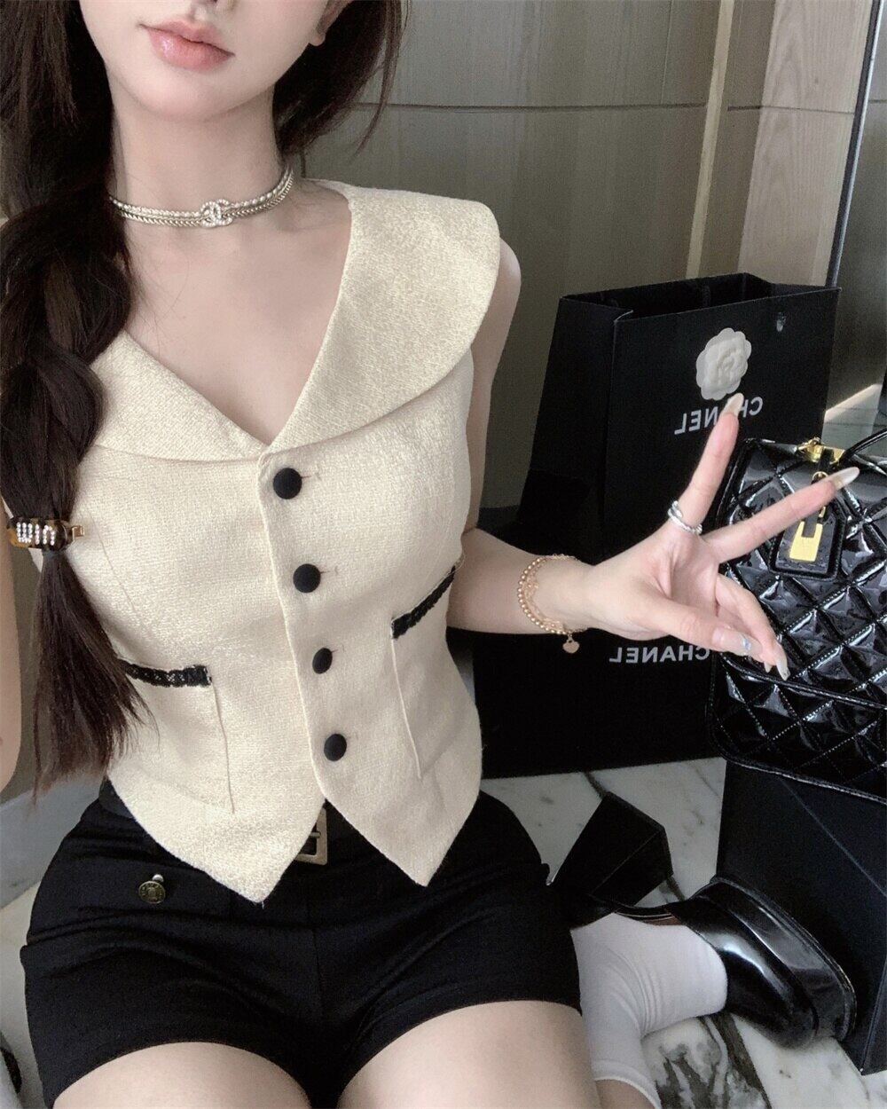 フレンチツーピースセットノースリーブシャツトップ+ショートスーツSweet Girls 2ピースパンツセット 大人ガーリー スウィート キュート カジュアル