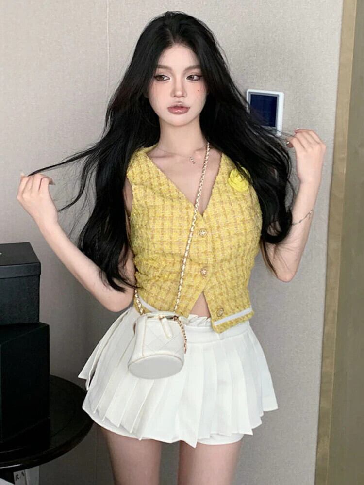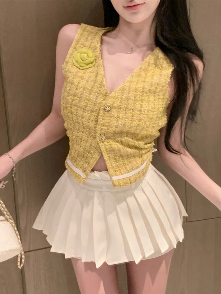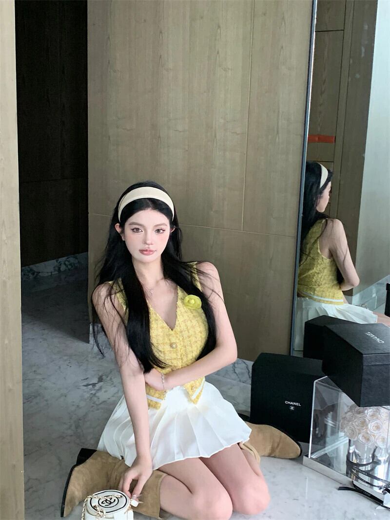フレンチスモールフレグランスツーピースセットノースリーブツイードベストジャケットコート+プリーツスカートスーツ甘い2ピース衣装 大人ガーリー スウィート キュート カジュアル