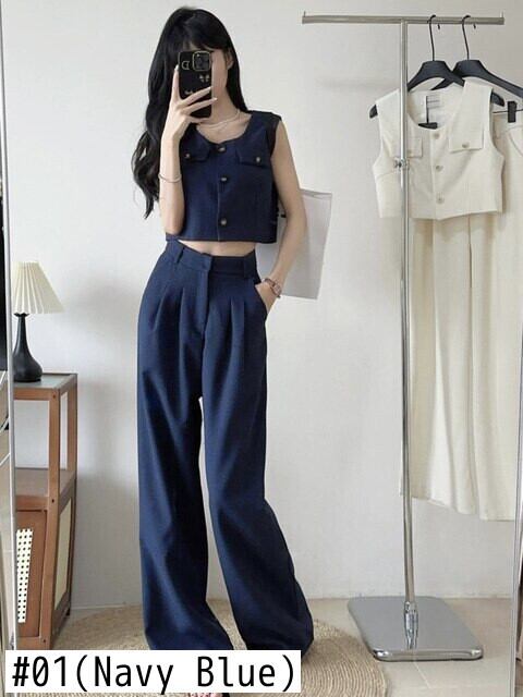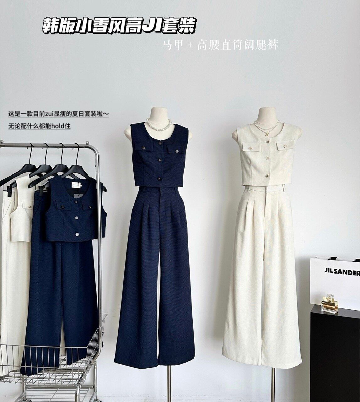 フランス小さ香りツーピースズボンセットベストクロップトップ & ワイドレッグパンツセット 2 ピーススーツ ワイドパンツ