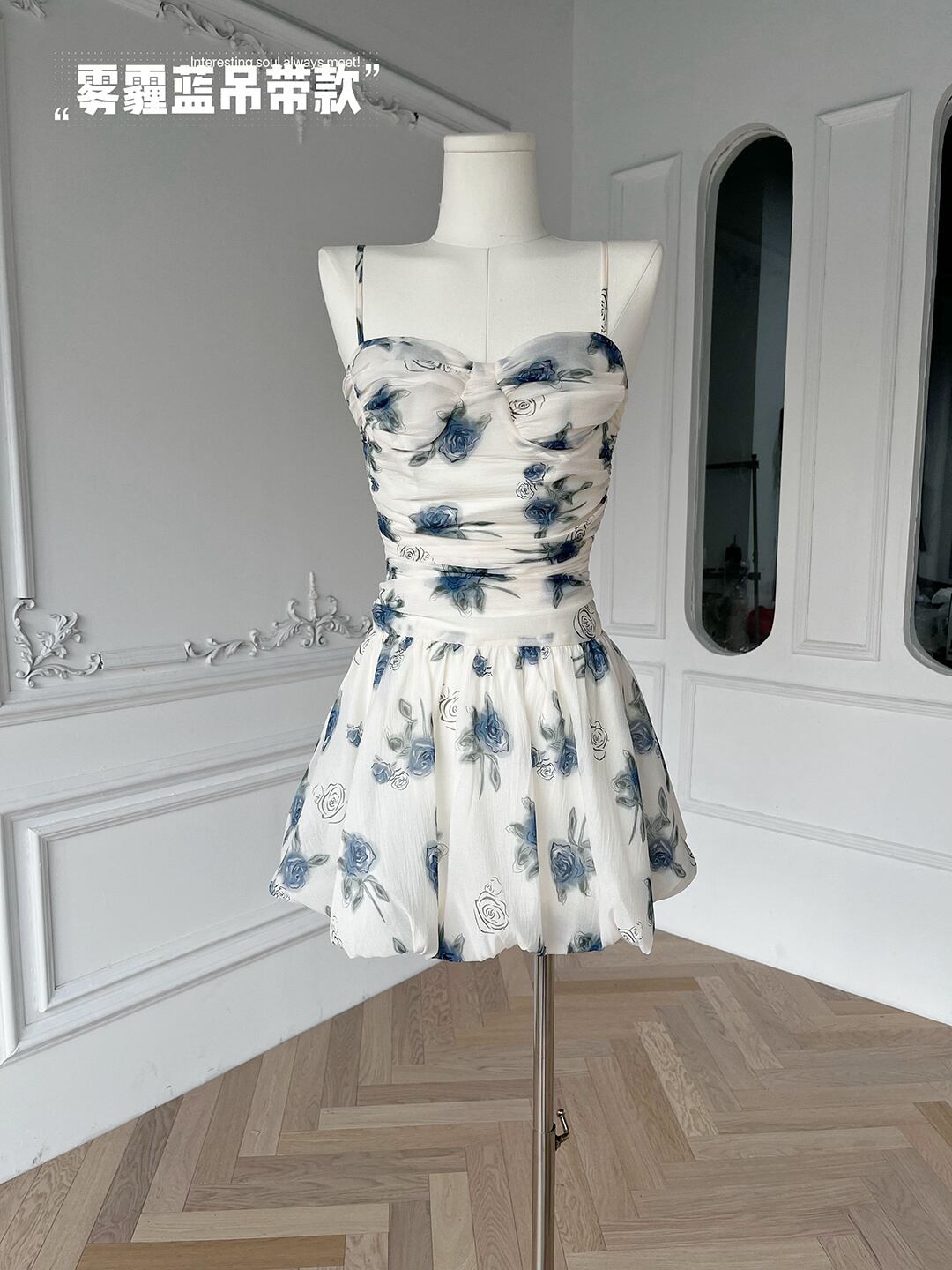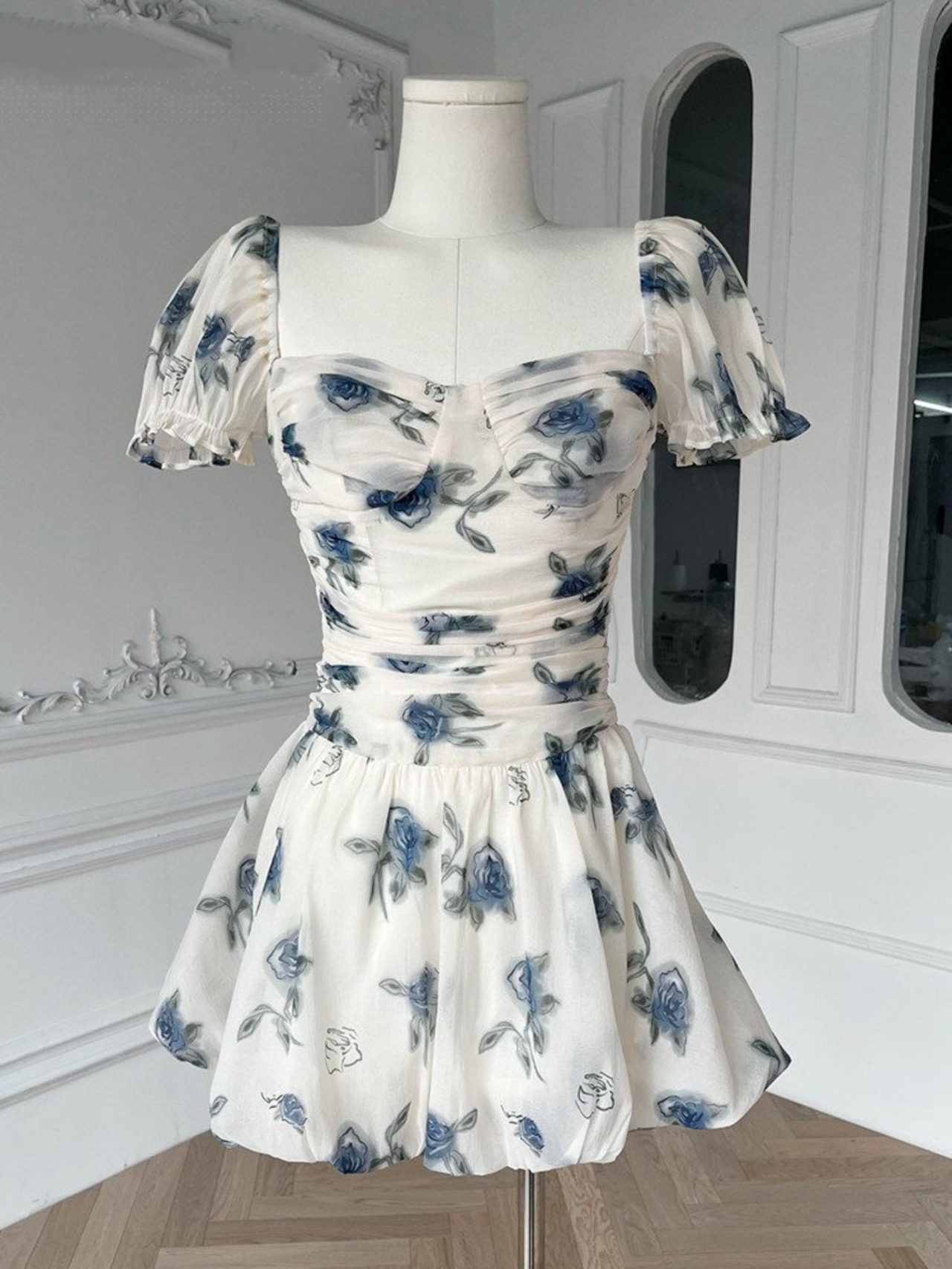 女子甘い花バブルスリーブショートドレスフレンチ油絵ホリデービーチサマードレス 大人ガーリー スウィート キュート カジュアル 夏物 フラワーデザイン