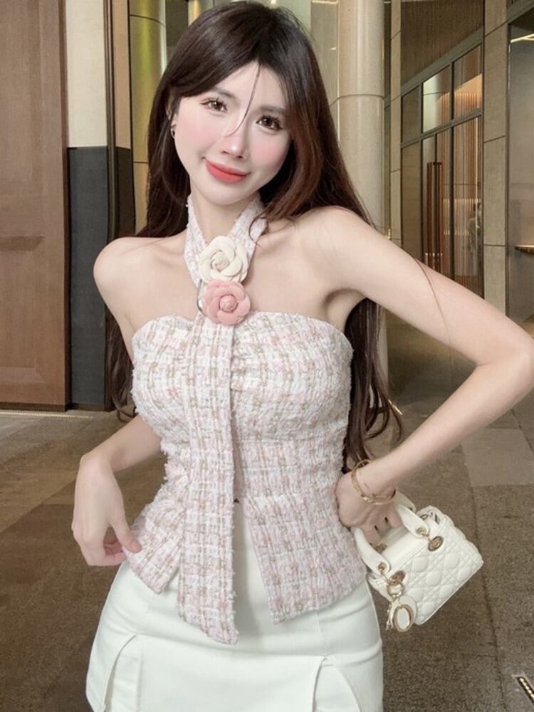 フレンチツイードアウタートップガールズホットスイートセクシースリムキャミソールシンプルシックオールマッチサマートップス 大人ガーリー スウィート キュート カジュアル 夏物