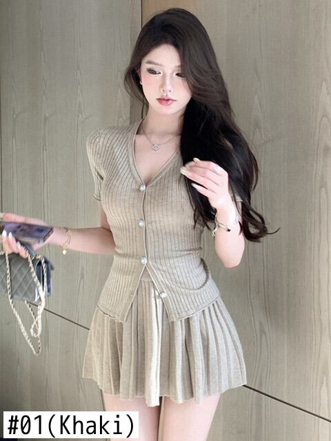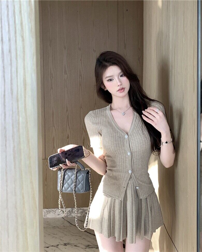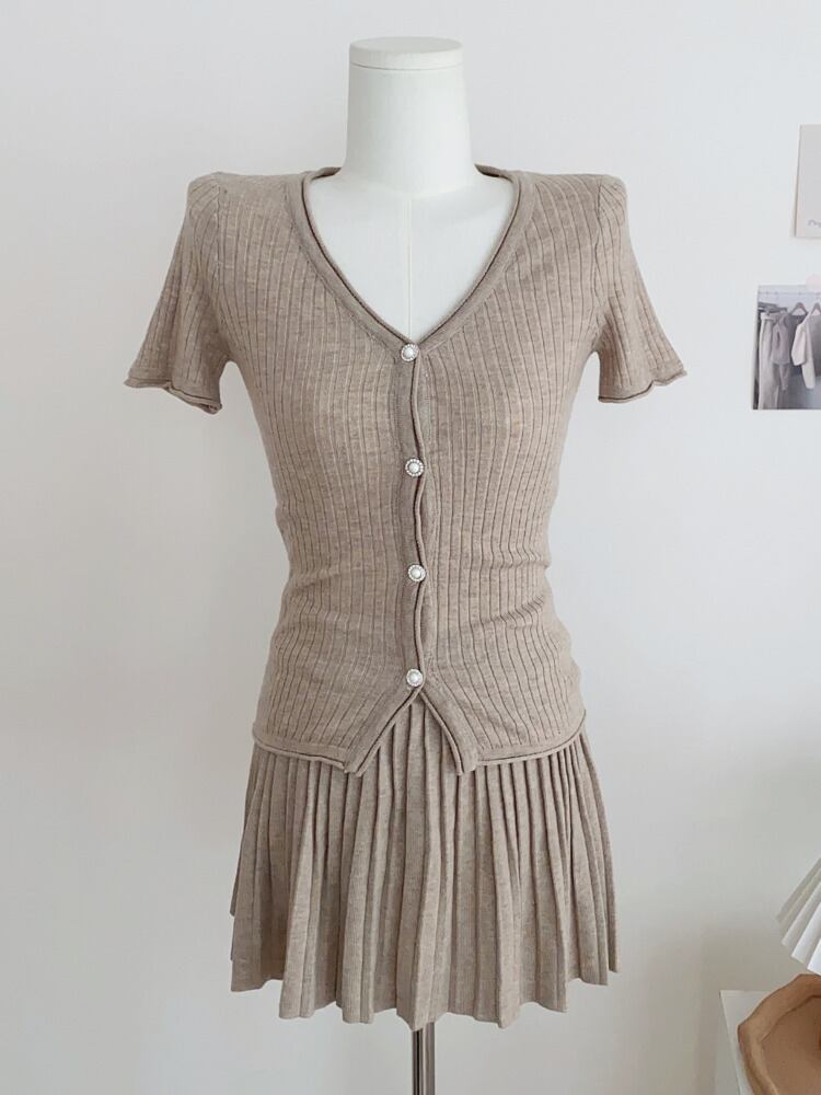 小さ香りニット 2 点セットセーターカーディガン + ウエストプリーツスカートセット夏 2 ピーススーツ サマー 夏物