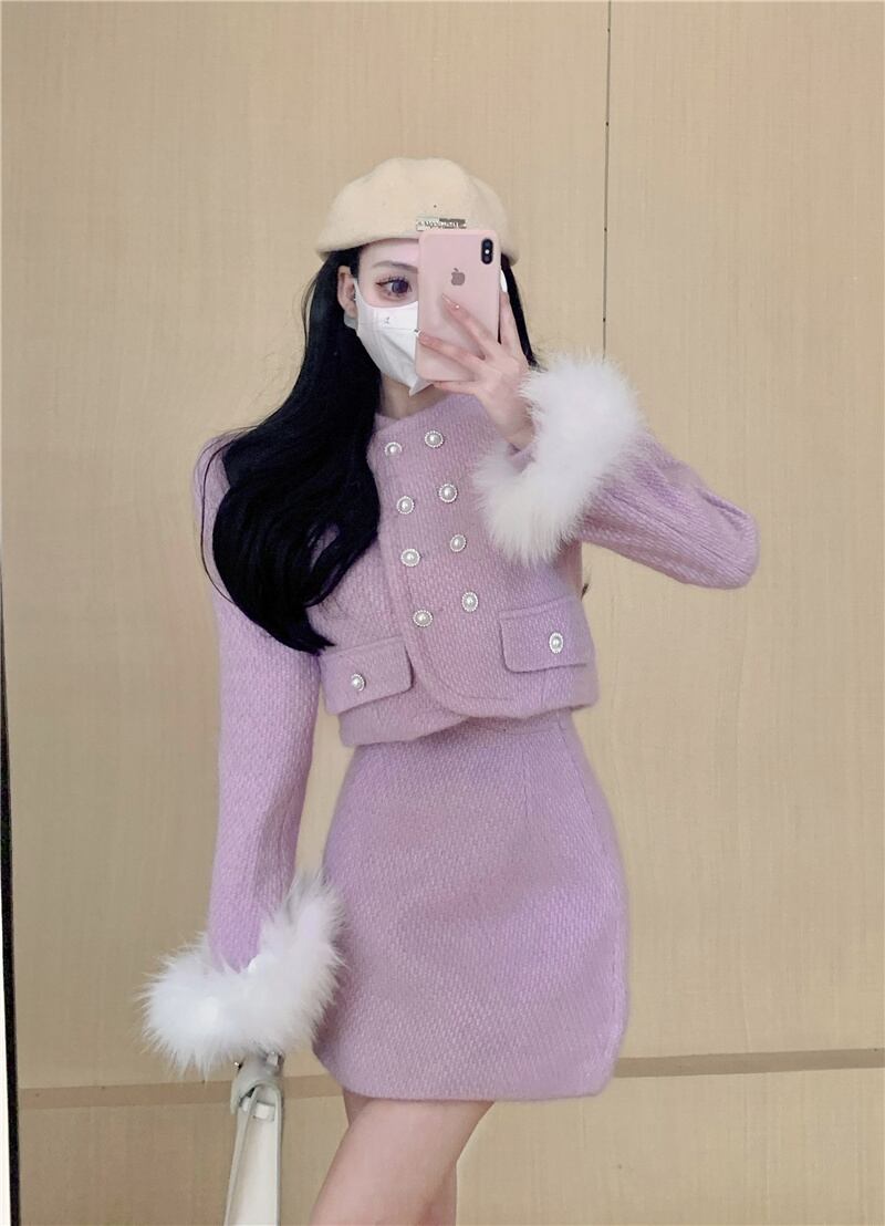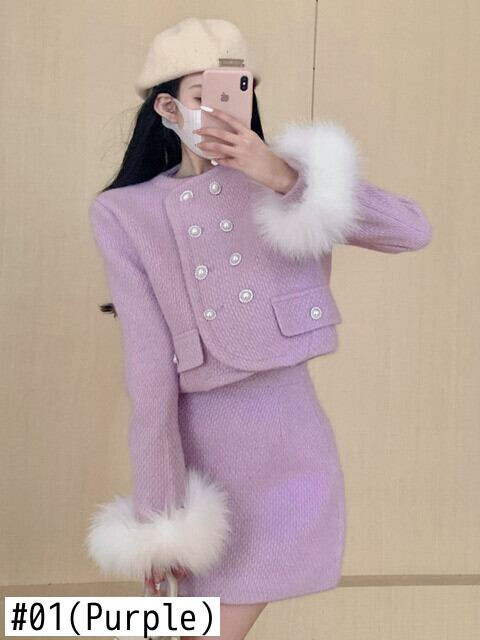 秋冬小さ香りツーピースセットショートジャケットコート + スカートスーツ甘い 2 ピース衣装 大人ガーリー スウィート キュート カジュアル ウィンター 冬物