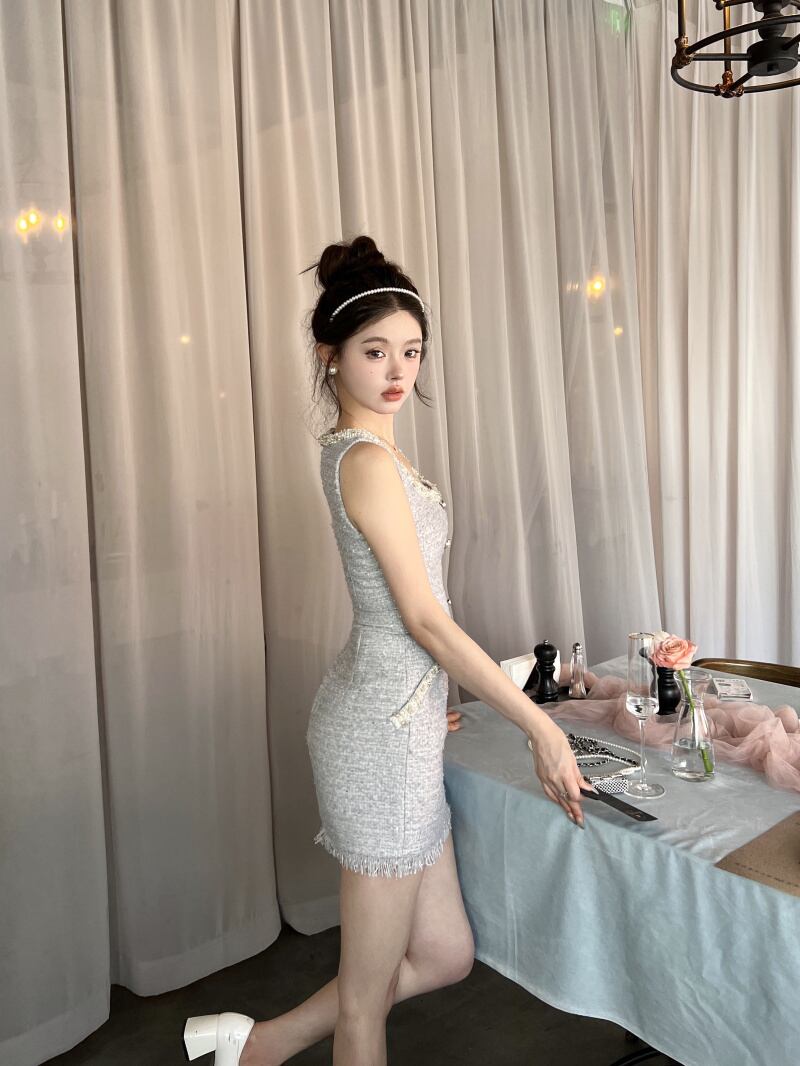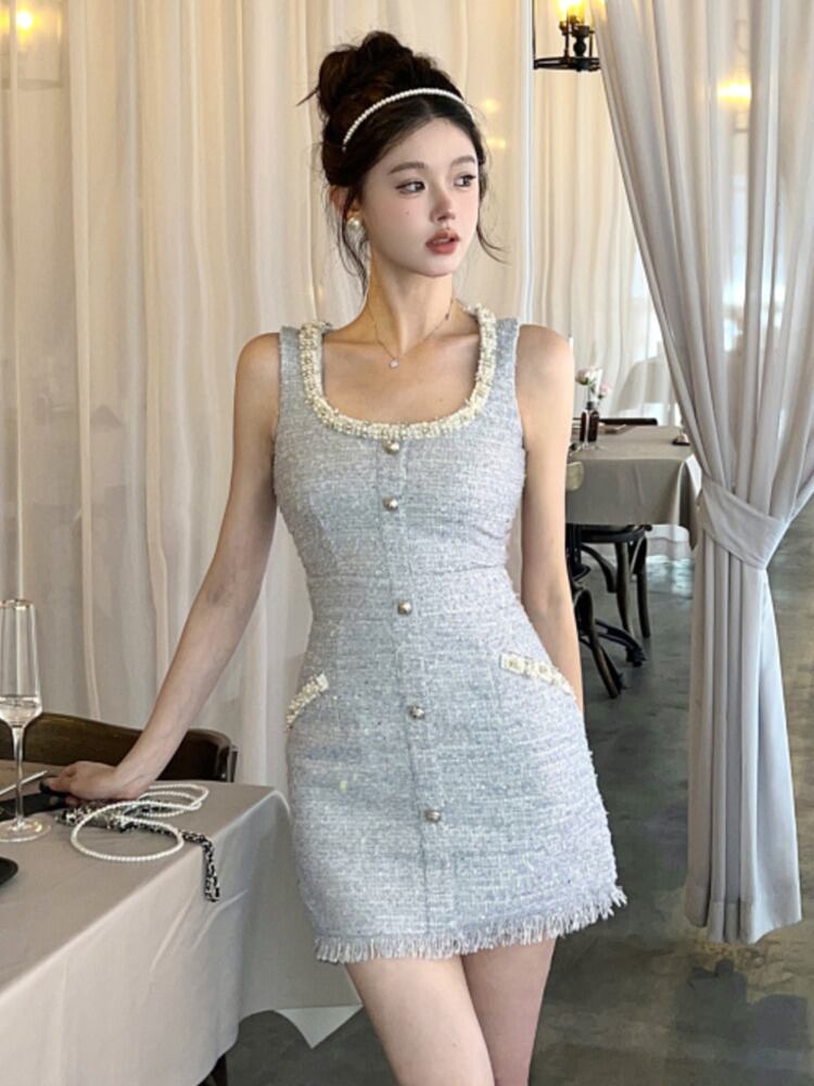 フランス小さ香りツイードパーティードレス Hotsweet ビーズタンクスリムサマードレス 大人ガーリー スウィート キュート カジュアル 夏物