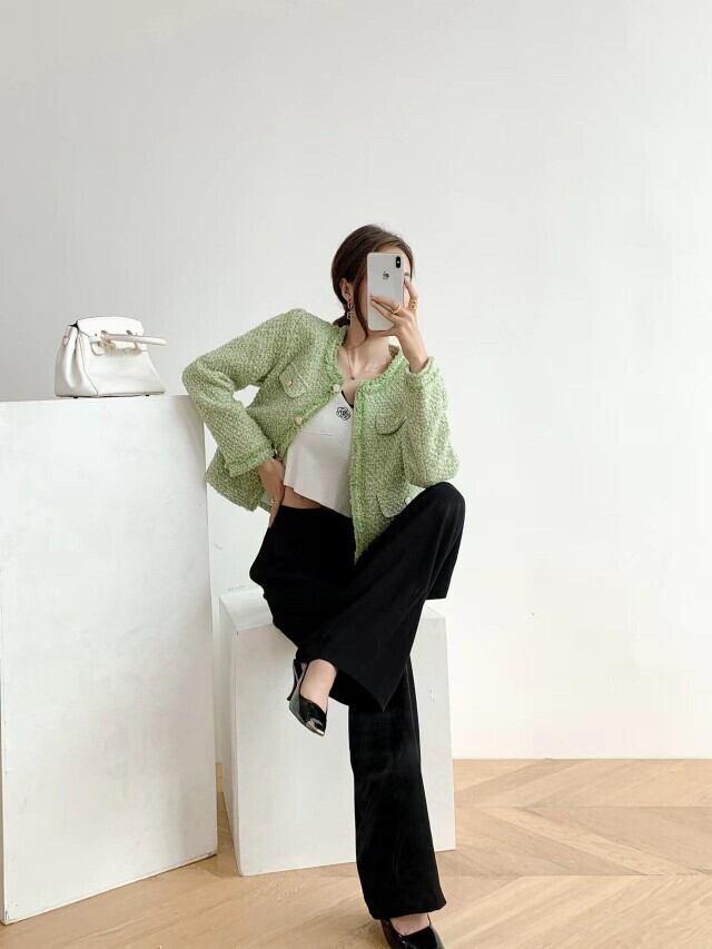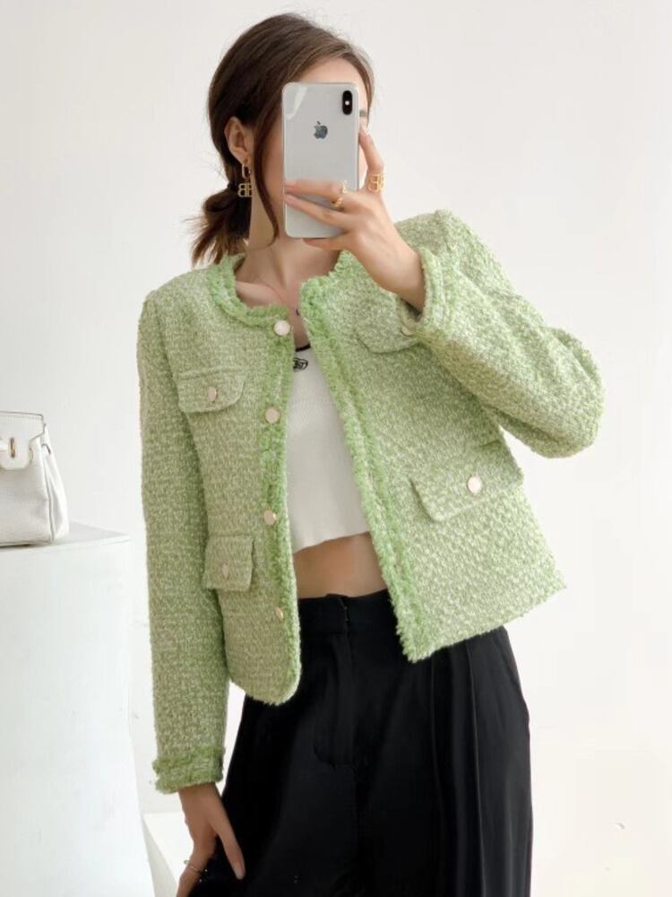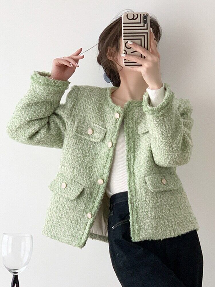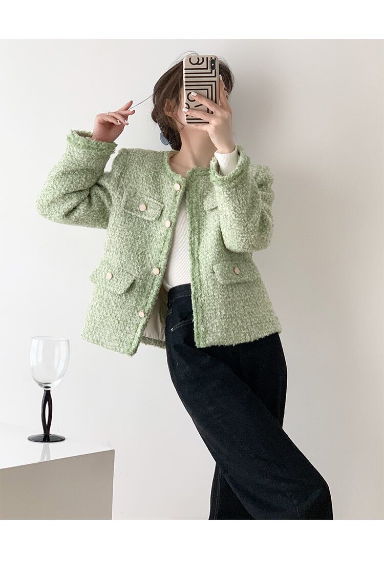 フランス小さ香りツイードジャケット秋冬グリーンウールコートアウター Casaco Jaqueta ウィンター 冬物