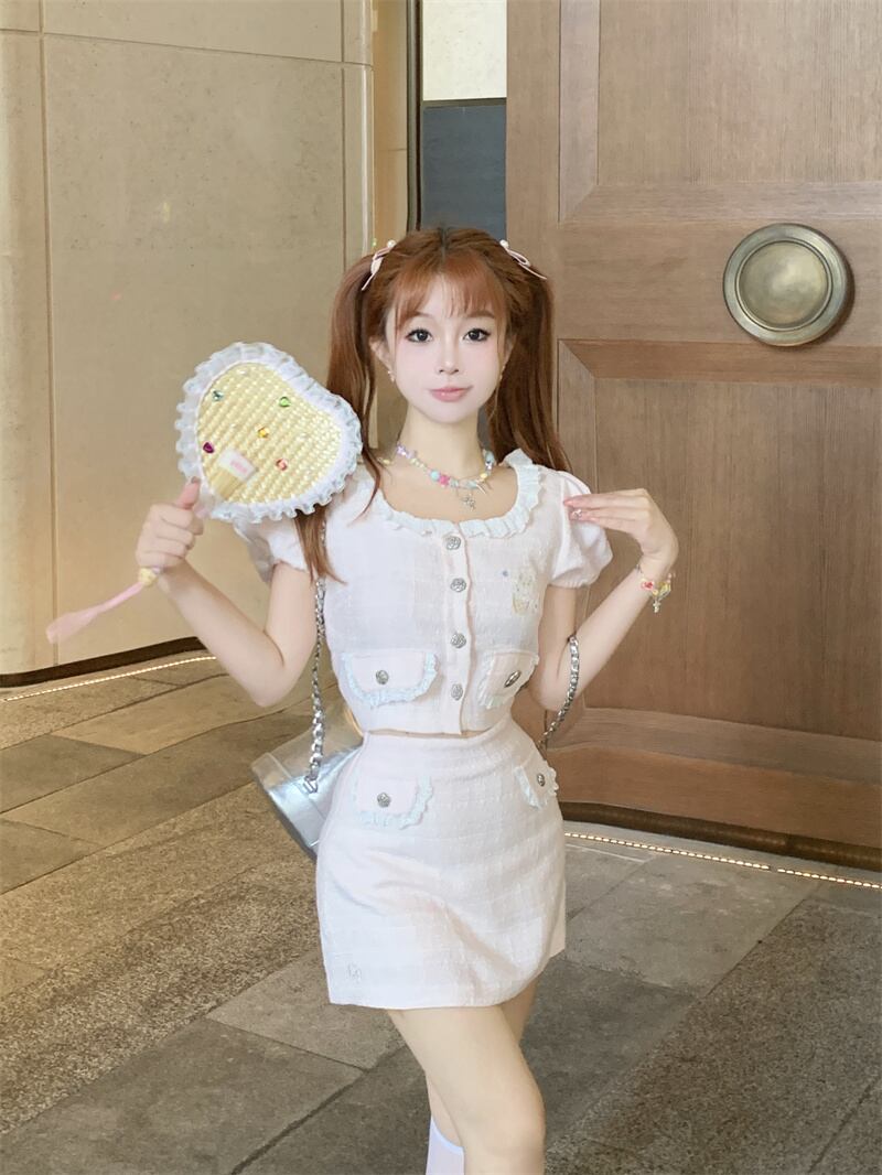 フランス小さ香りツーピースセットパフスリーブシャツトップ + ミニスカートスーツ甘い 2 点セット 大人ガーリー スウィート キュート カジュアル