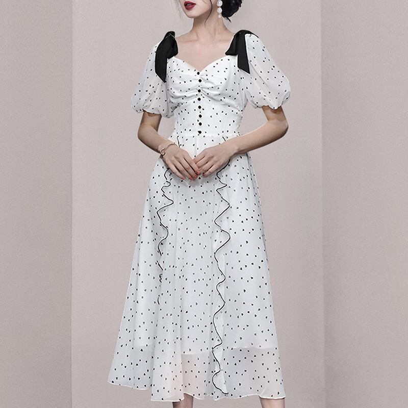 OL ドットプリントシフォンロングドレスフリルホリデーサマードレス Vestidos ラッフル 夏物