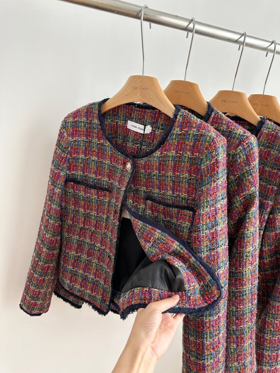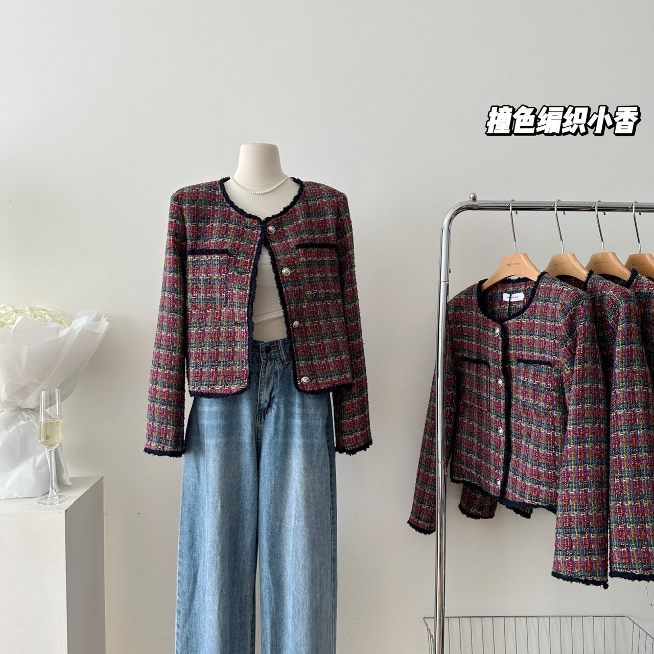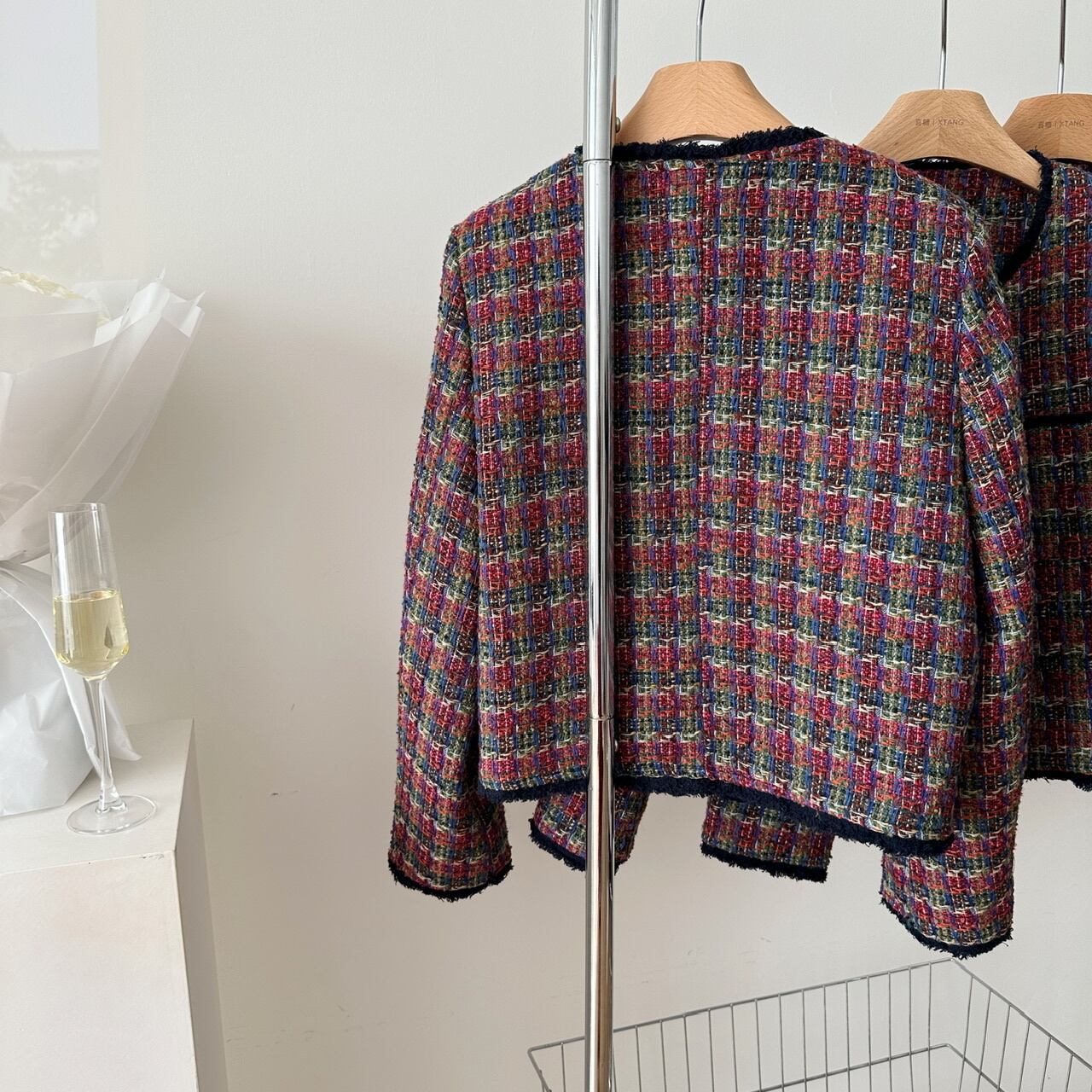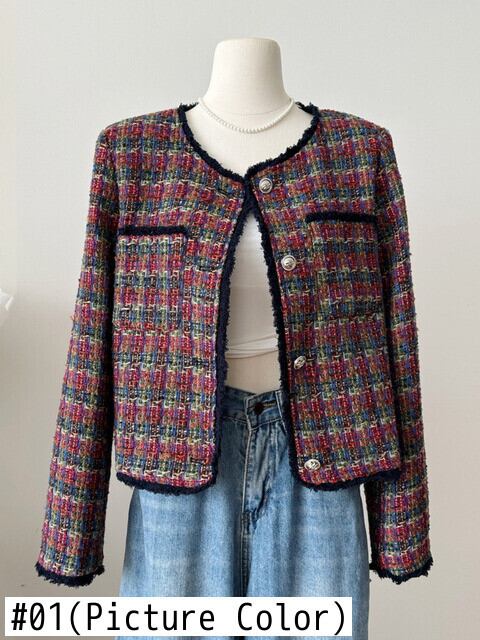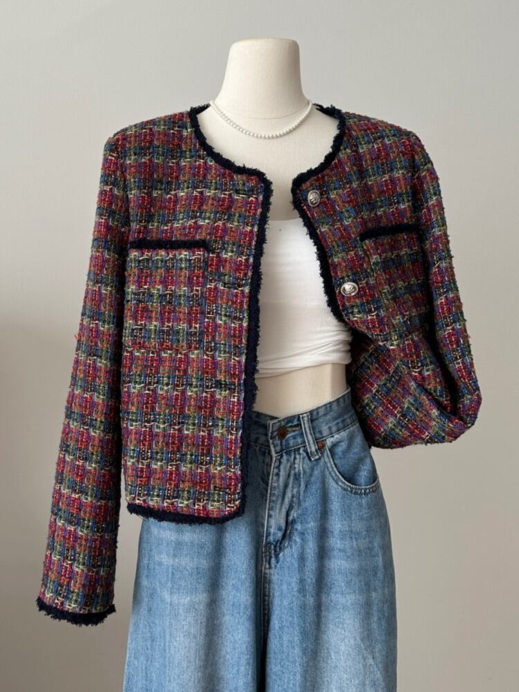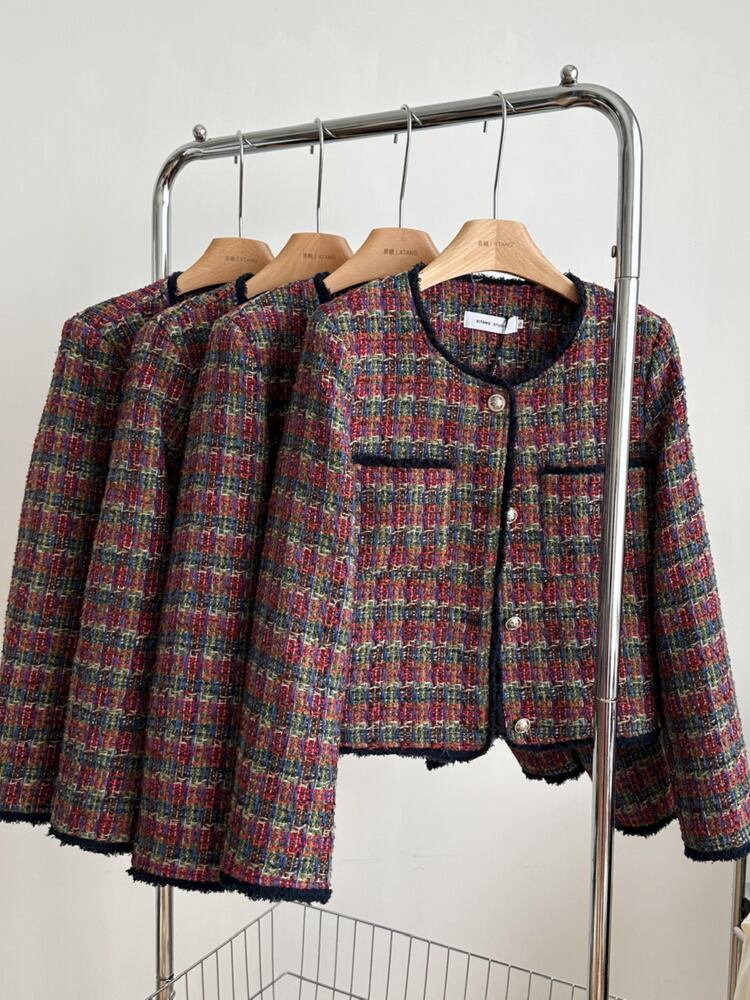 フランス小さフレグランスツイードジャケット秋冬チェック柄織りショートコート オータム 秋物 ウィンター 冬物