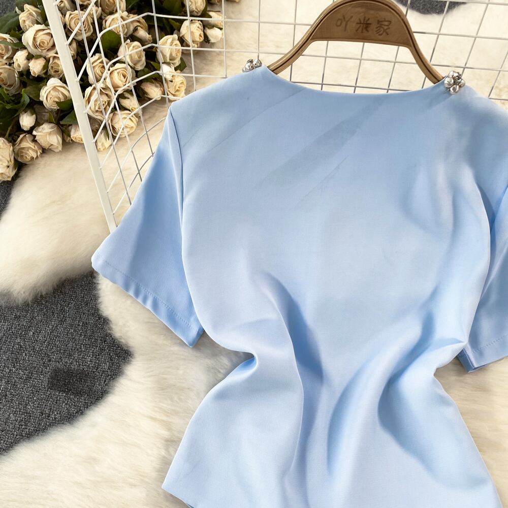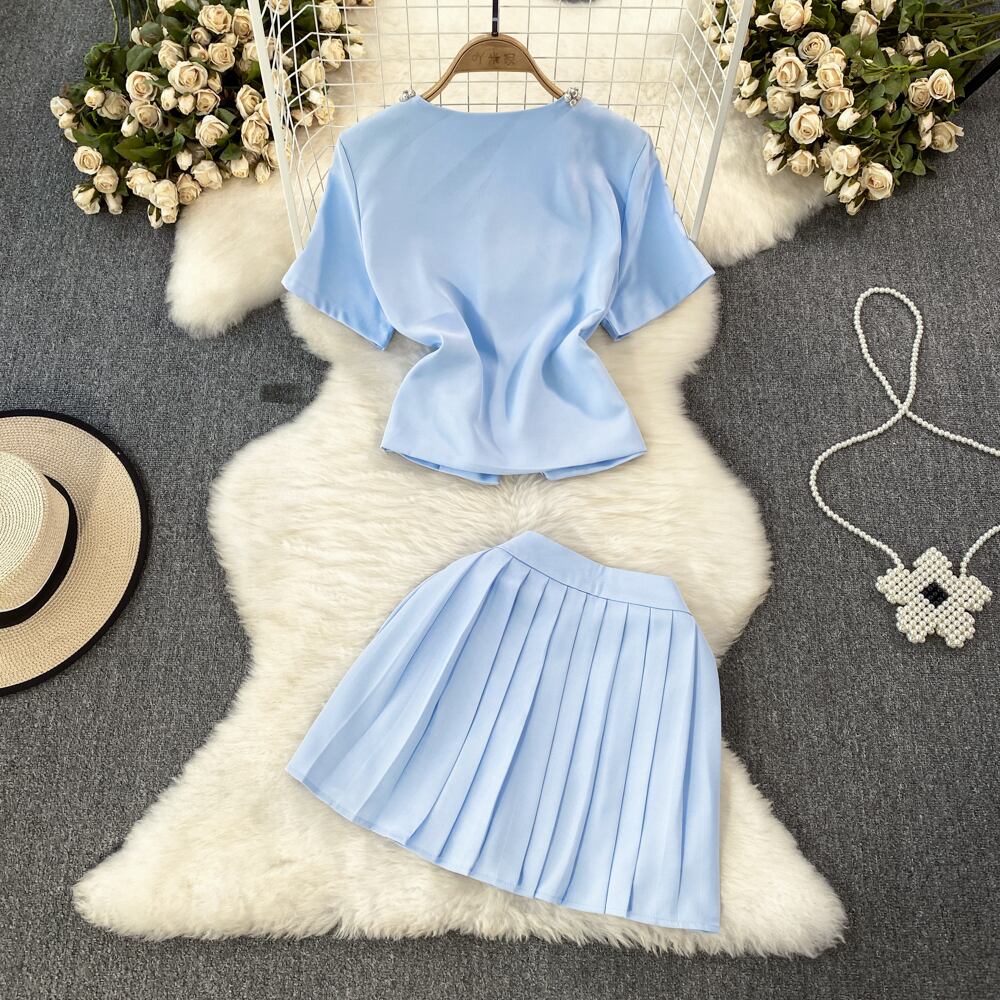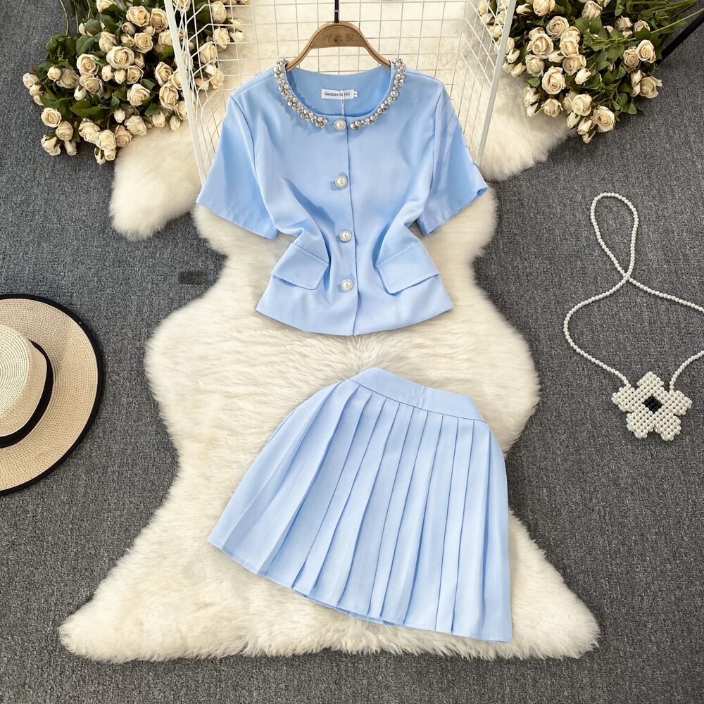 甘い小さ香り 2 点セット高級ビーズシャツブラウストップ + プリーツスカートスーツ夏 2 点セット 大人ガーリー スウィート キュート カジュアル サマー 夏物