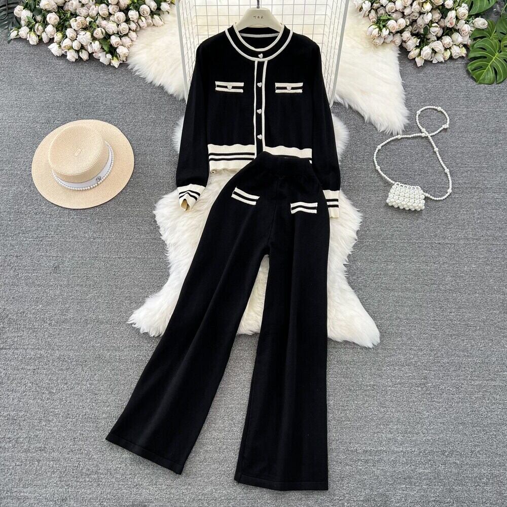 秋冬小さ香りニット 2 点セットカーディガンコート + パンツスーツトラックスーツ 2 ピースパンツセット オータム 秋物 ウィンター 冬物