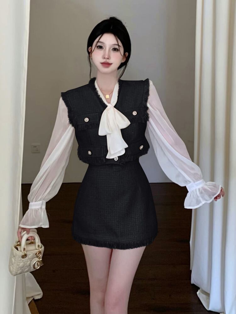 小さフレグランス 3 点セットボウシャツ + ベストトップ + ミニスカートセット秋甘い 3 ピース衣装 リボン 大人ガーリー スウィート キュート カジュアル オータム 秋物