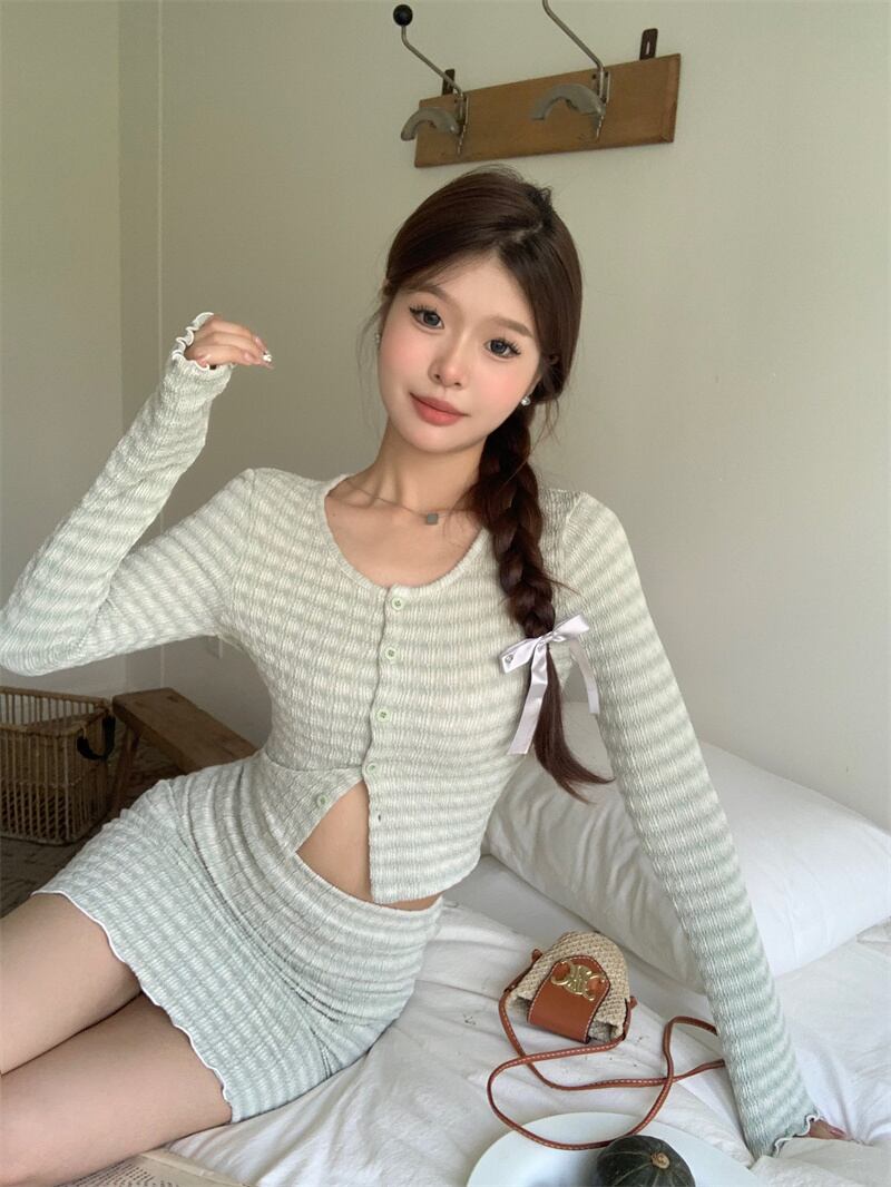 甘い小さ香りツーピースセットカーディガンコートクロップトップ + ミニスカートセット秋 2 ピーススーツ 大人ガーリー スウィート キュート カジュアル オータム 秋物