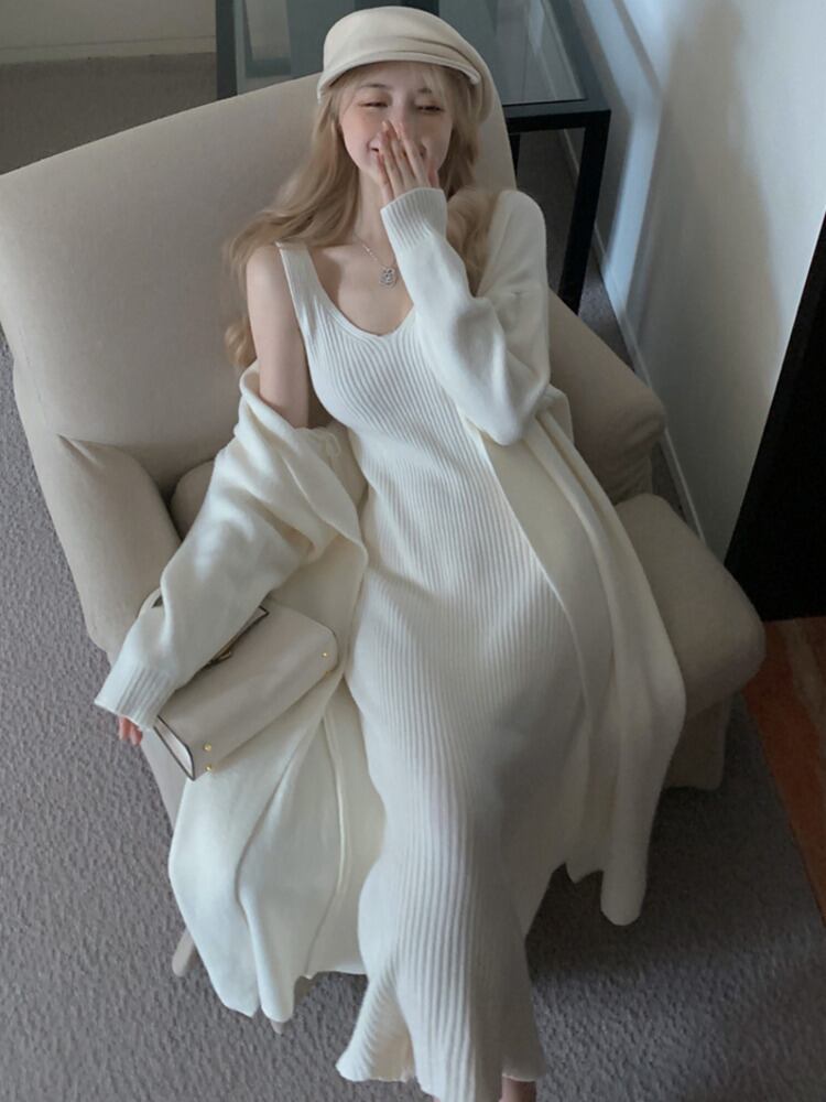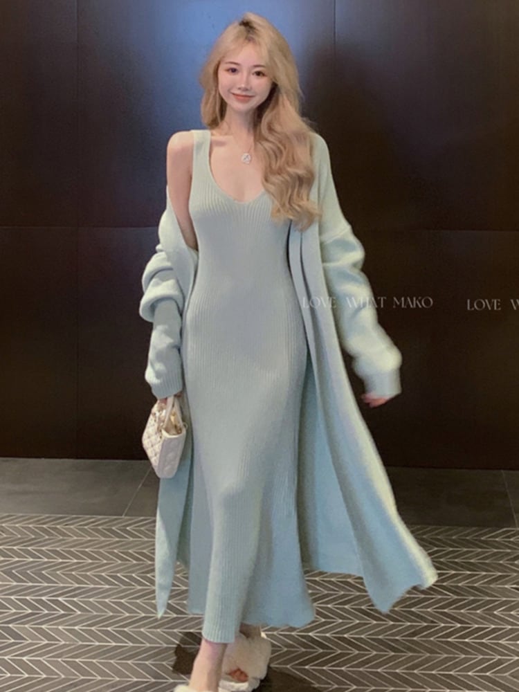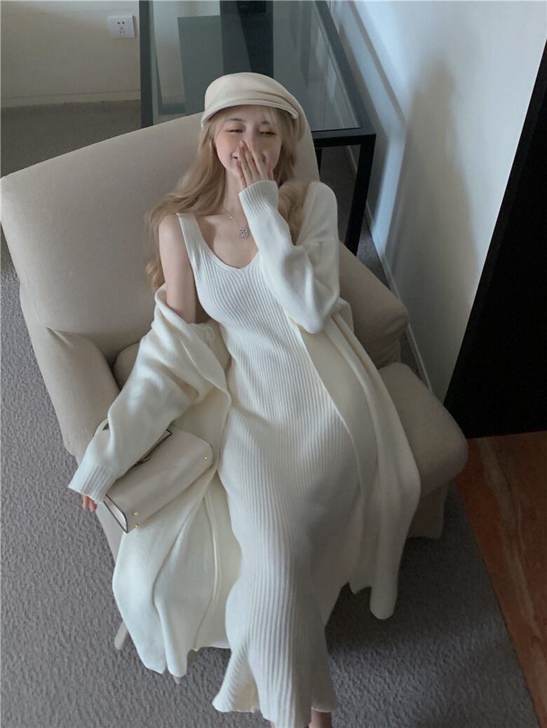 秋冬ニット 2 点セット服セーターカーディガンコート + ロングドレス 2 点セット オータム 秋物 ウィンター 冬物