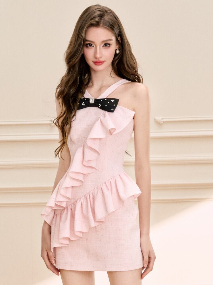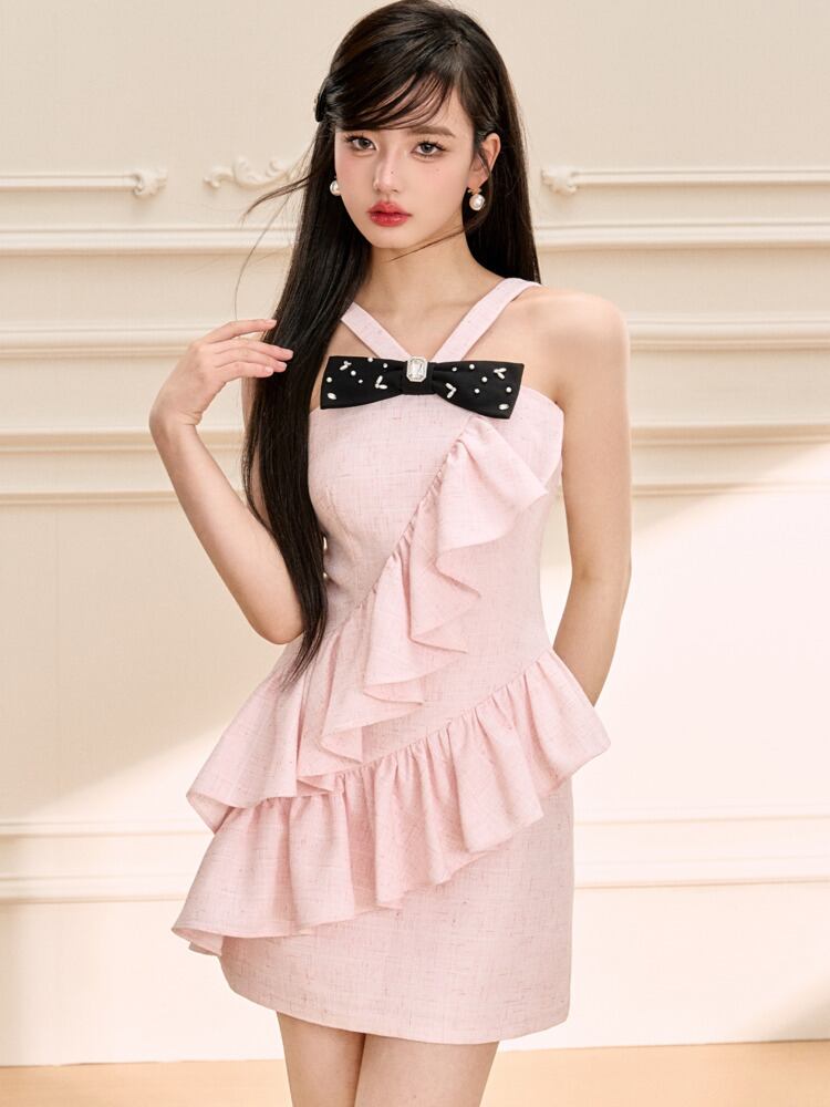 甘い小さ香りミニドレスフレンチリボンフリルサマードレス Hotsweet セクシータンクパーティードレス ラッフル 大人ガーリー スウィート キュート カジュアル 夏物