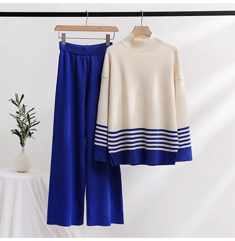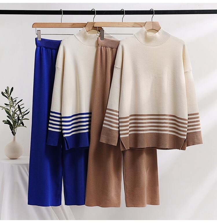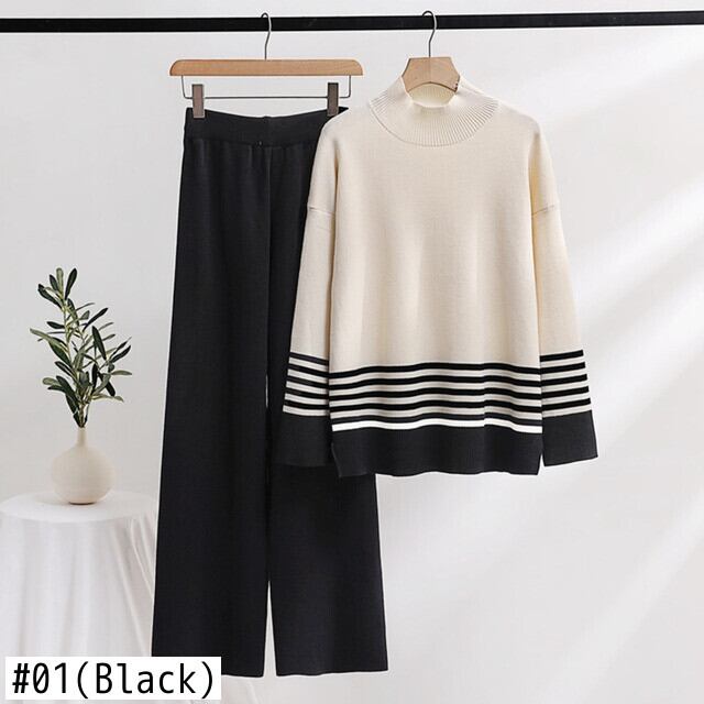 ニット 2 枚セットルーズプルオーバーセーター + ワイドレッグロングパンツセット秋冬ジャージ ウィンター 冬物 ワイドパンツ