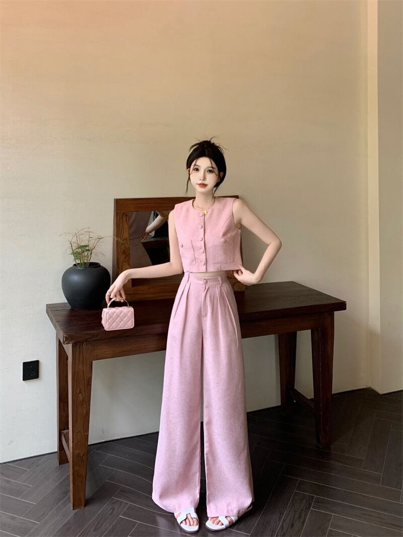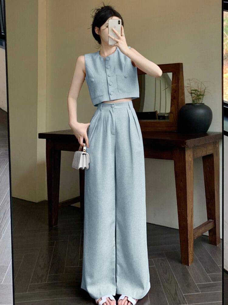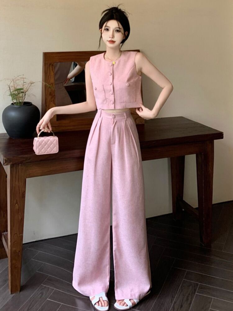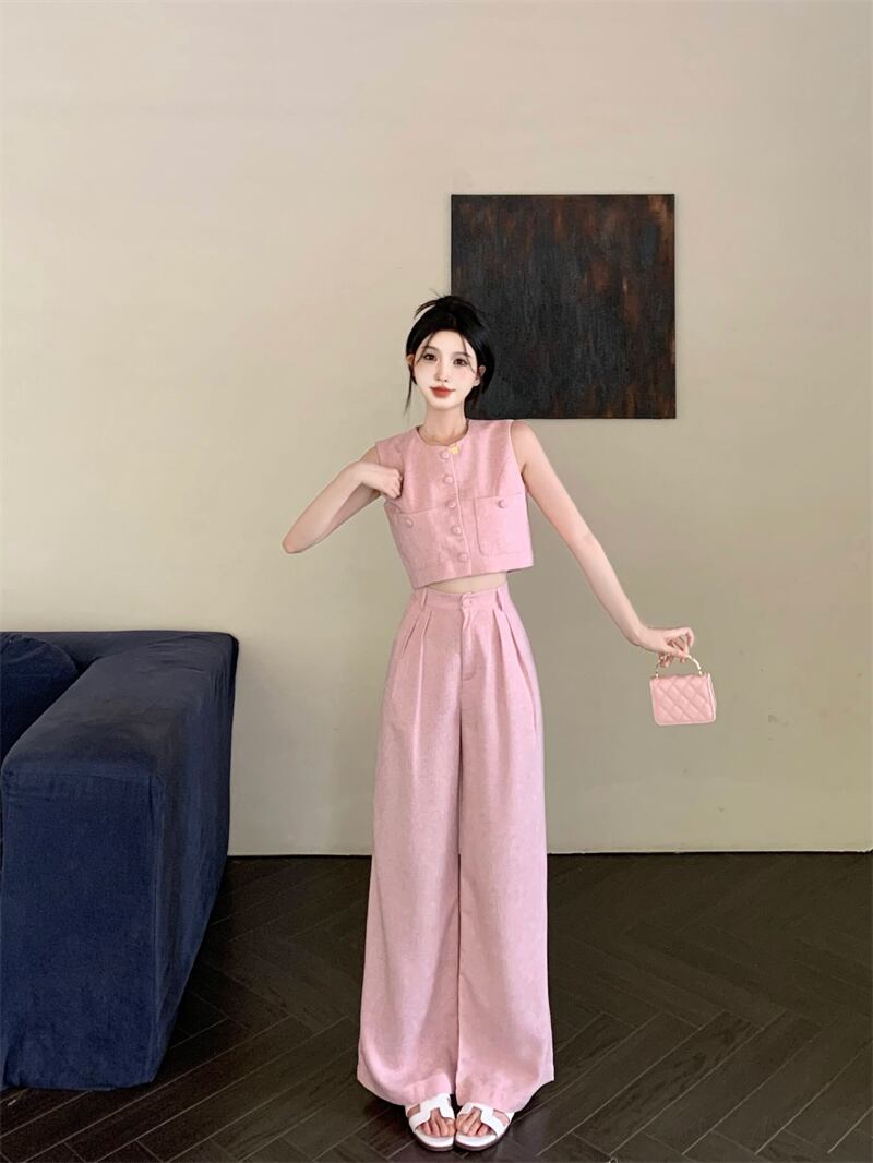 ストリートフレンチスモールフレグランスツーピースセットベストトップ&ワイドレッグパンツセットフライドストリート2ピーススーツ ワイドパンツ