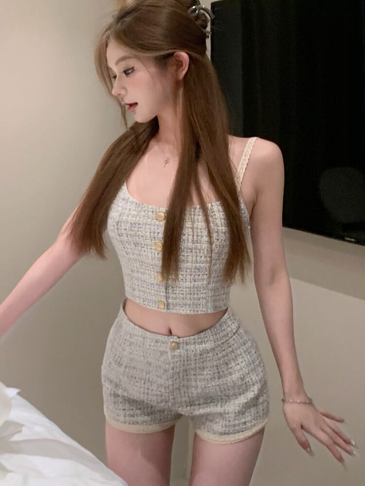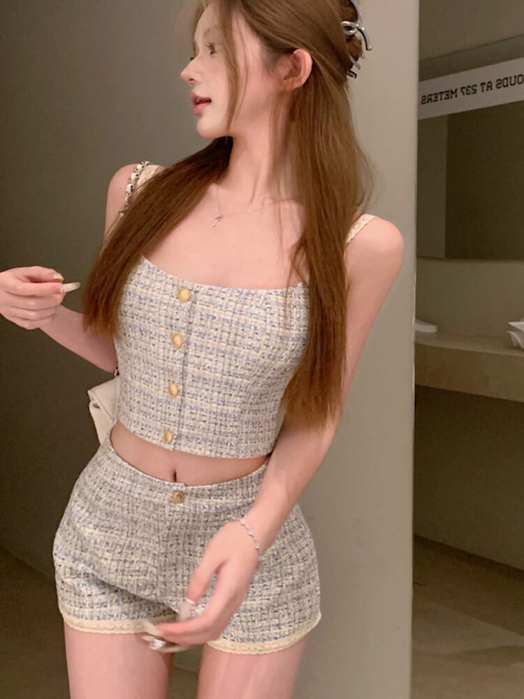 フランス小さフレグランス 2 ピースセット衣装ガール Hotsweet ベストクロップトップ + ショートセット夏ツーピースパンツセット 大人ガーリー スウィート キュート カジュアル サマー 夏物