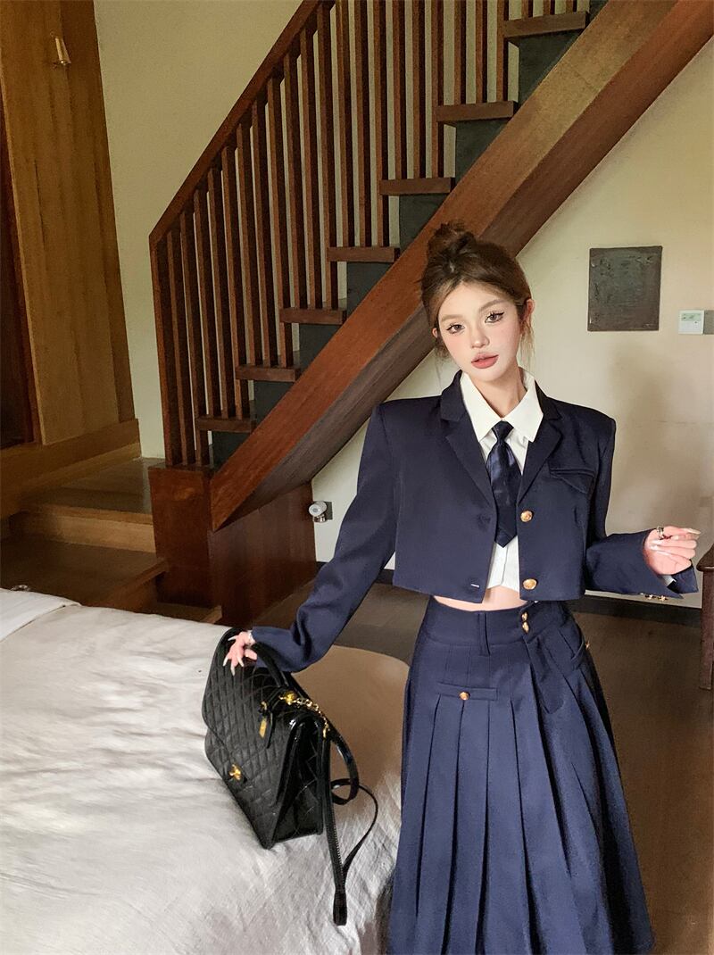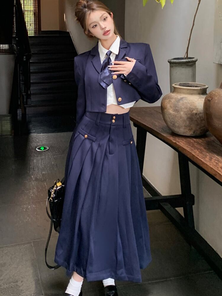 プレッピースタイルツーピースセットブレザーコート+プリーツロングスカートセットOL 2ピース衣装
