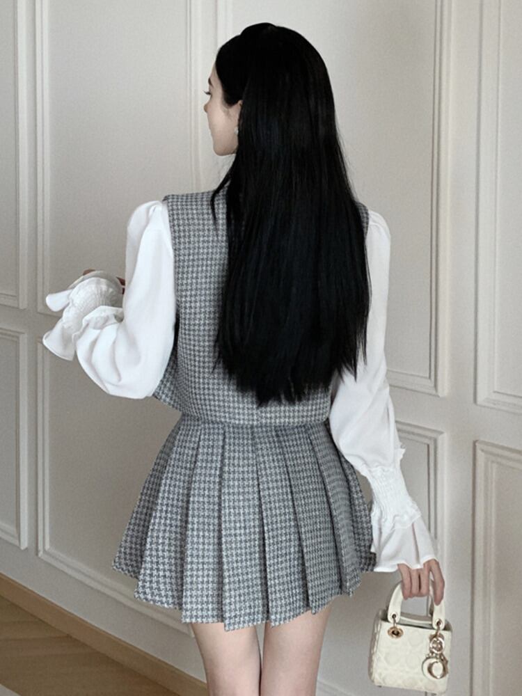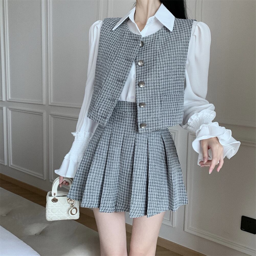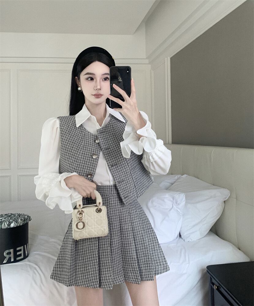 秋小さ香りスリーピースセットベスト + シャツ + ウエストプリーツスカート 3 ピーススーツ オータム 秋物