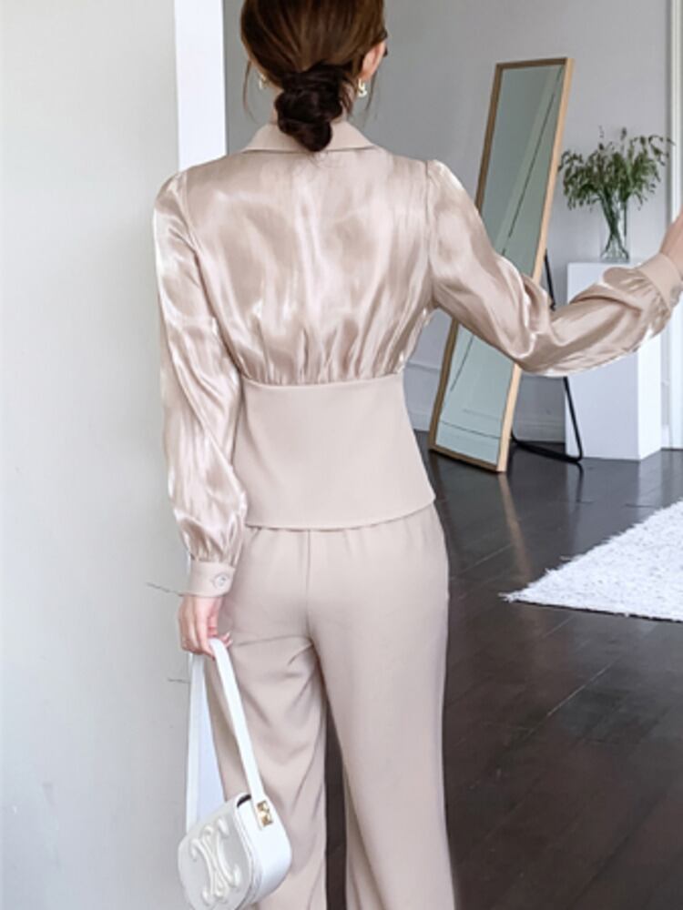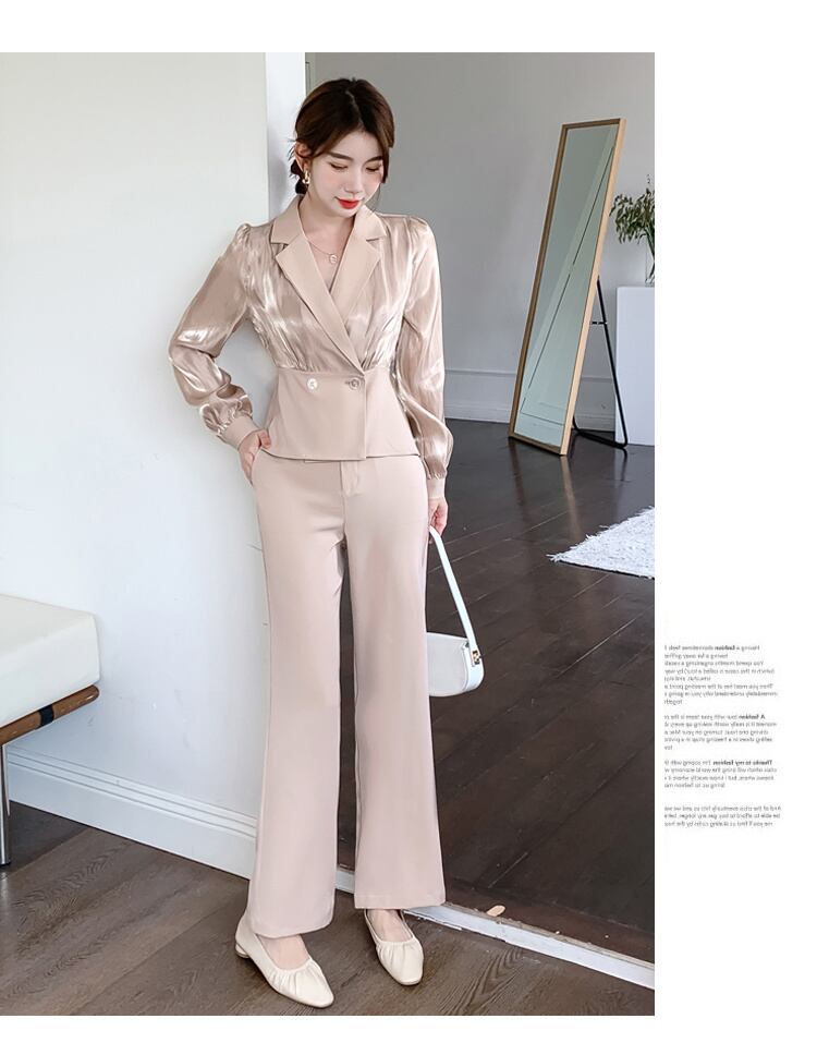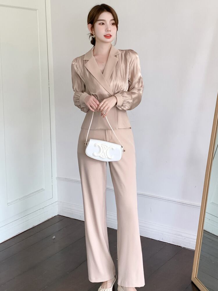 秋人気サテンパンツツーピースセットブレザートップ + ワイドレッグパンツセット OL 2 ピースパンツスーツ オータム 秋物 ワイドパンツ