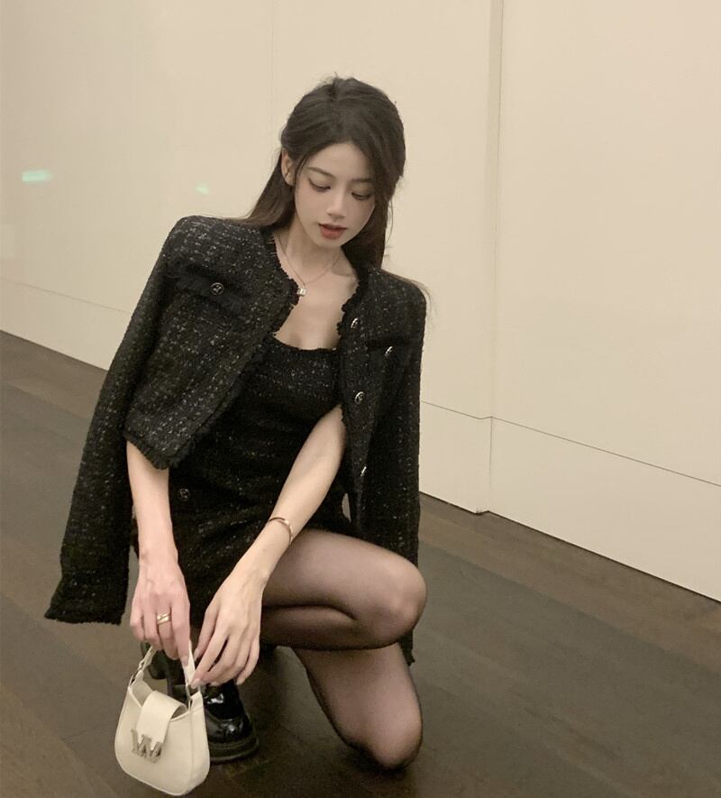 ストリートフレンチ高級小さ香りツイードツーピースセットショートジャケットコート+ドレススーツY2Kストリート2ピース衣装